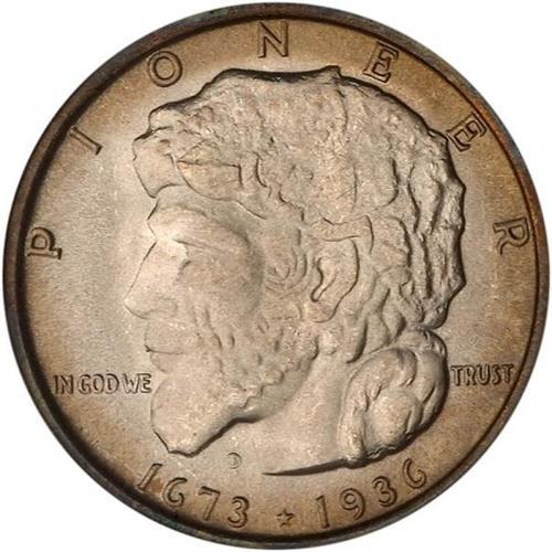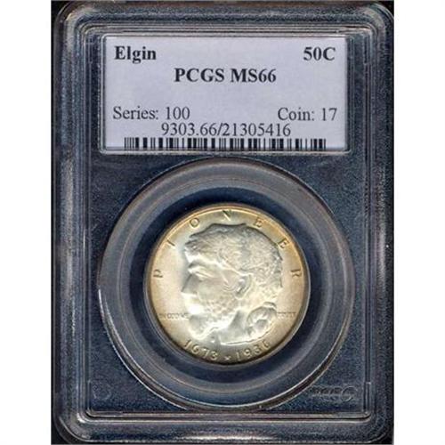 <b>1936 Elgin Half Dollar. PCGS graded MS66.</b> An unusually high quality coin for the date, this gem quality specimen displays riveting lustrous heavily frosted surfaces, is delicately, with sharp detail including the pioneer's coonskin cap <b>(PCGS # 9303)</b>
