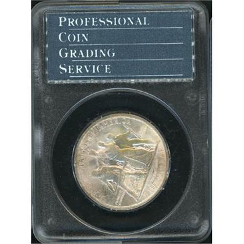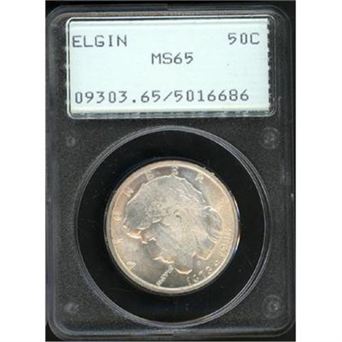 These commemoratives celebrate the centennial of the city of Elgin, Illinois, the obverse head is a copy of "Head of a Pioneer" by Trygve Rovelstad. The statue from which this head derives is represented on the reverse by the coin's artist who was also sculpted the statue. There were 20,000 Elgins sold at $1.50 each out of an original authorization of 25,000; the remaining 5,000 were returned to the mint and remelted in 1937. (#9303)