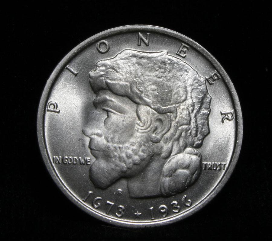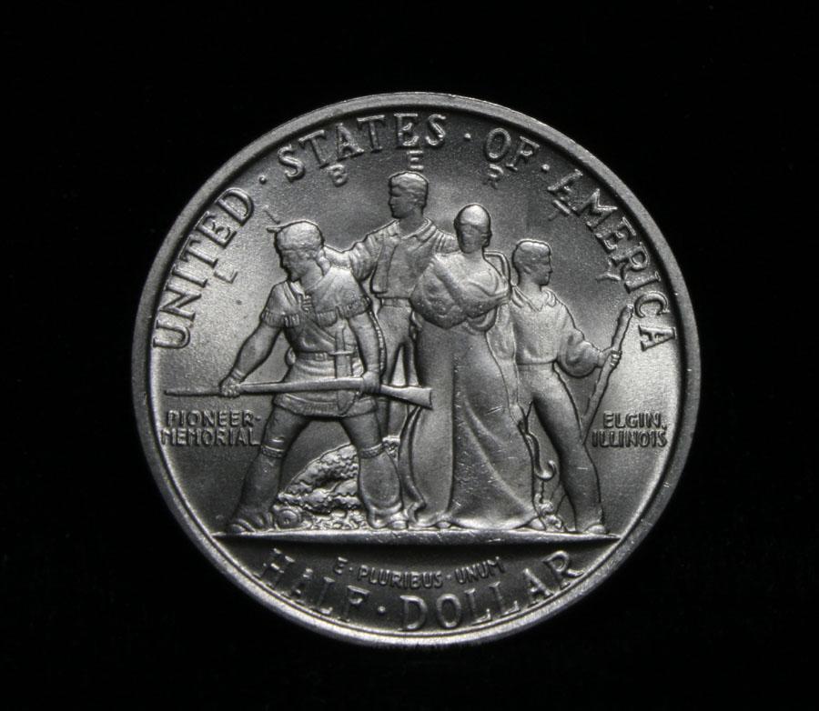Beautiful Lustrous Example. Nice Strike. It has the traditional Modern Matt Proof look to it, often seen on the Elgin. This issue is rarely, if ever, found fully struck in the highest points of obverse and reverse. The infant held in its mother’s arms is almost always indistinct. When checking for wear always check for such wear on the pioneer’s cheekbone or the rifleman’s left shoulder. Coin World's Coin Values lists ms66 at $550 and The Wholesale Greysheet lists ms66 at $450 Estimated Value $500