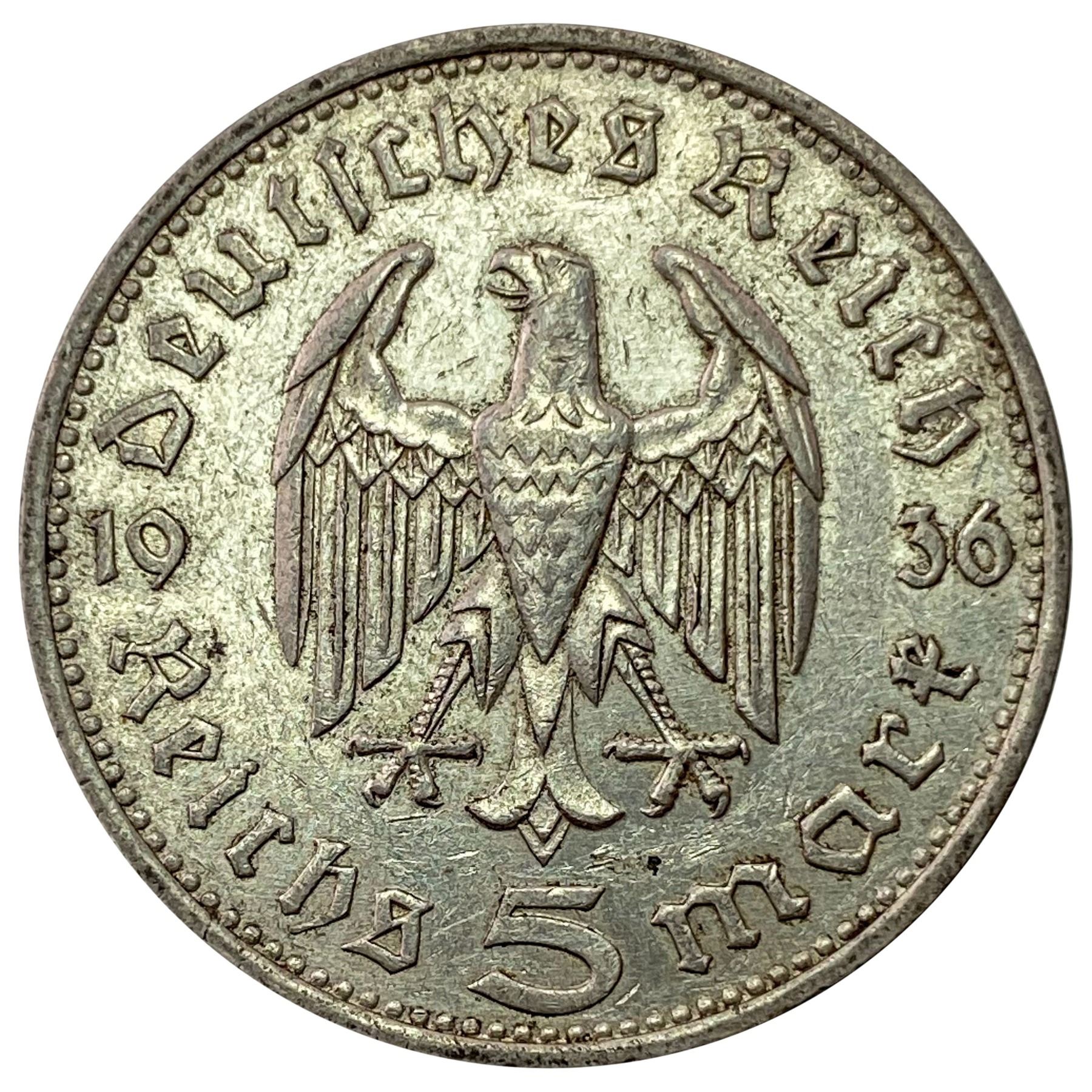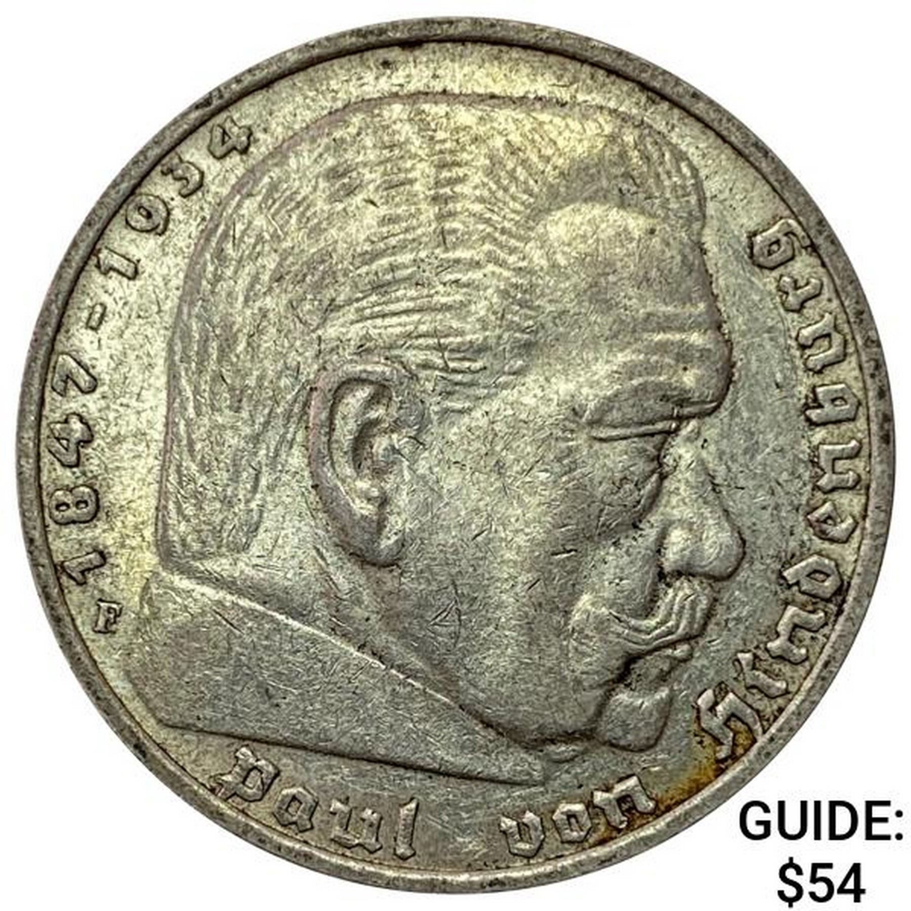 1936-F Germany Silver 5 Reichsmark CLOSELY UNCIRCULATED