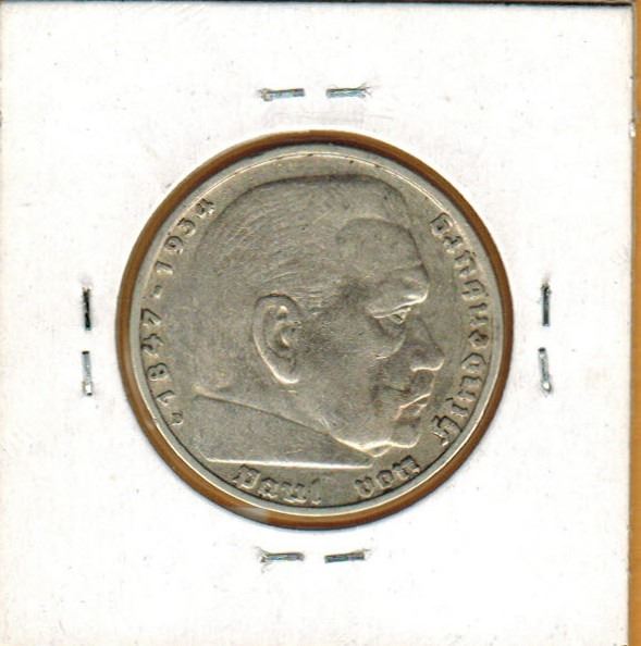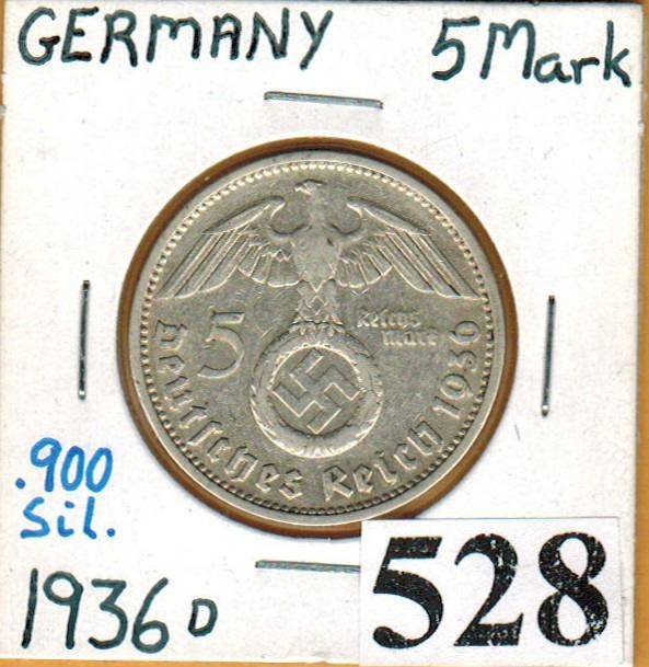 1936 GERMANY THIRD REICH - SILVER - 5 REICHSMARK - SWASTIKA within WREATH