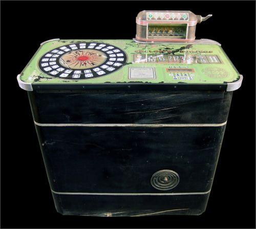 1936 Gallopin Dominos Roulette Machine mfg. by H.C. Evans, floor model in working condition. Top glass is cracked.
