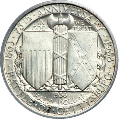 1936 Gettysburg Half Dollar. PCGS graded MS-64. Lightly toned, satiny surfaced; collectively a first-rate MS64 coin (PCGS # 9305) .