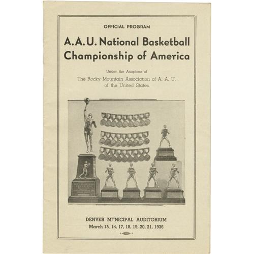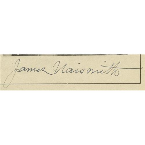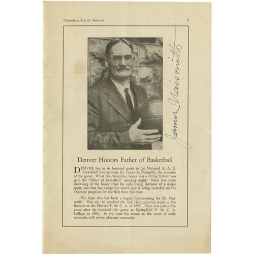 <B>1936 James Naismith Signed Basketball Program.</B></I> While the arguments about the Doubleday and Cartwright and the origins of baseball will never be settled, there is no such confusion about the birth of the sport of basketball. It came from the mind of Dr. James Naismith, who invented it at Springfield YMCA College in 1891. Just three years before Dr. Naismith's death, he was honored at the Denver Municipal Auditorium as it hosted the AAU National Basketball Championship of America. This scarce program from the early hardcourt event is afforded one-of-a-kind status by the appearance of a pristine fountain pen signature on page five beside a photograph and brief biography of the sport's inventor. Any fine basketball autograph collection must have a Naismith signature as its anchor, but examples are few and far between. This one is particularly desirable given its placement beside the most famous photo of Naismith, and the program is in fine undamaged condition besides. <I>LOA from PSA/DNA. LOA from James Spence Authentication.</B></I><BR><BR><b>Shipping:</b> Flat Material, Small (<a target="_blank" href="http://www.heritageauctions.com/common/shipping.php">view shipping information</a>)