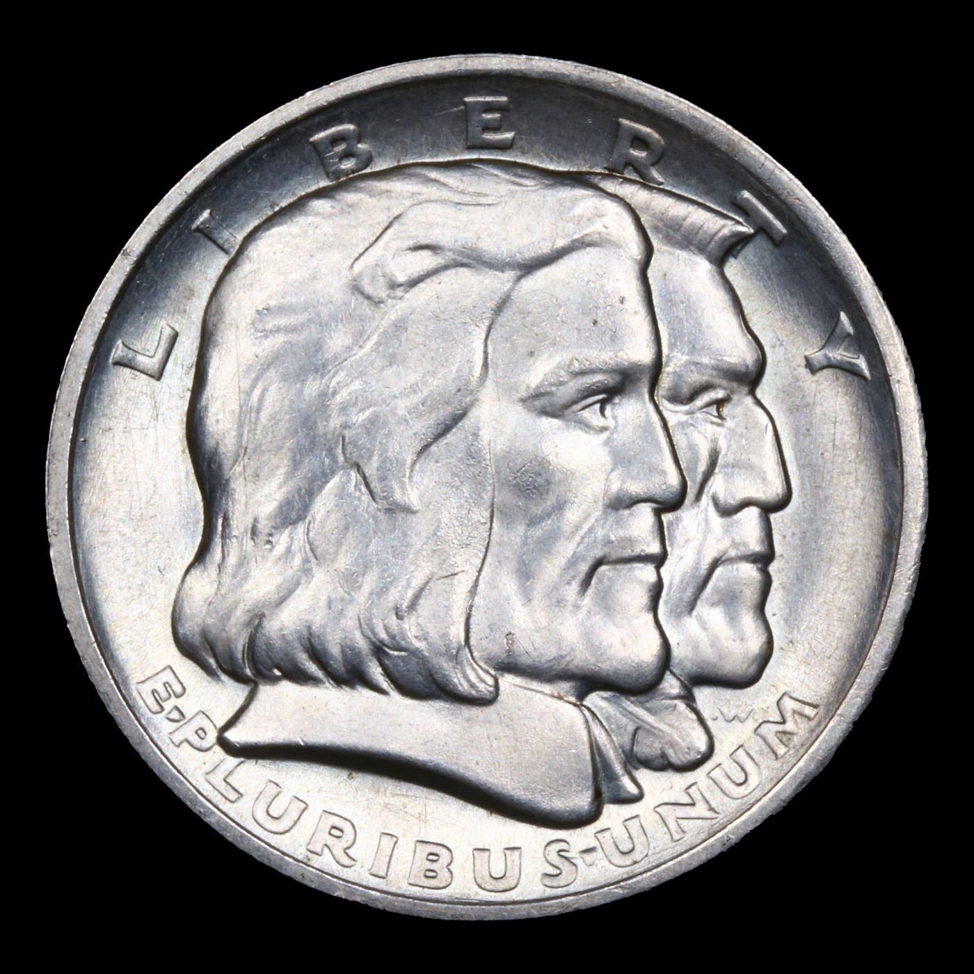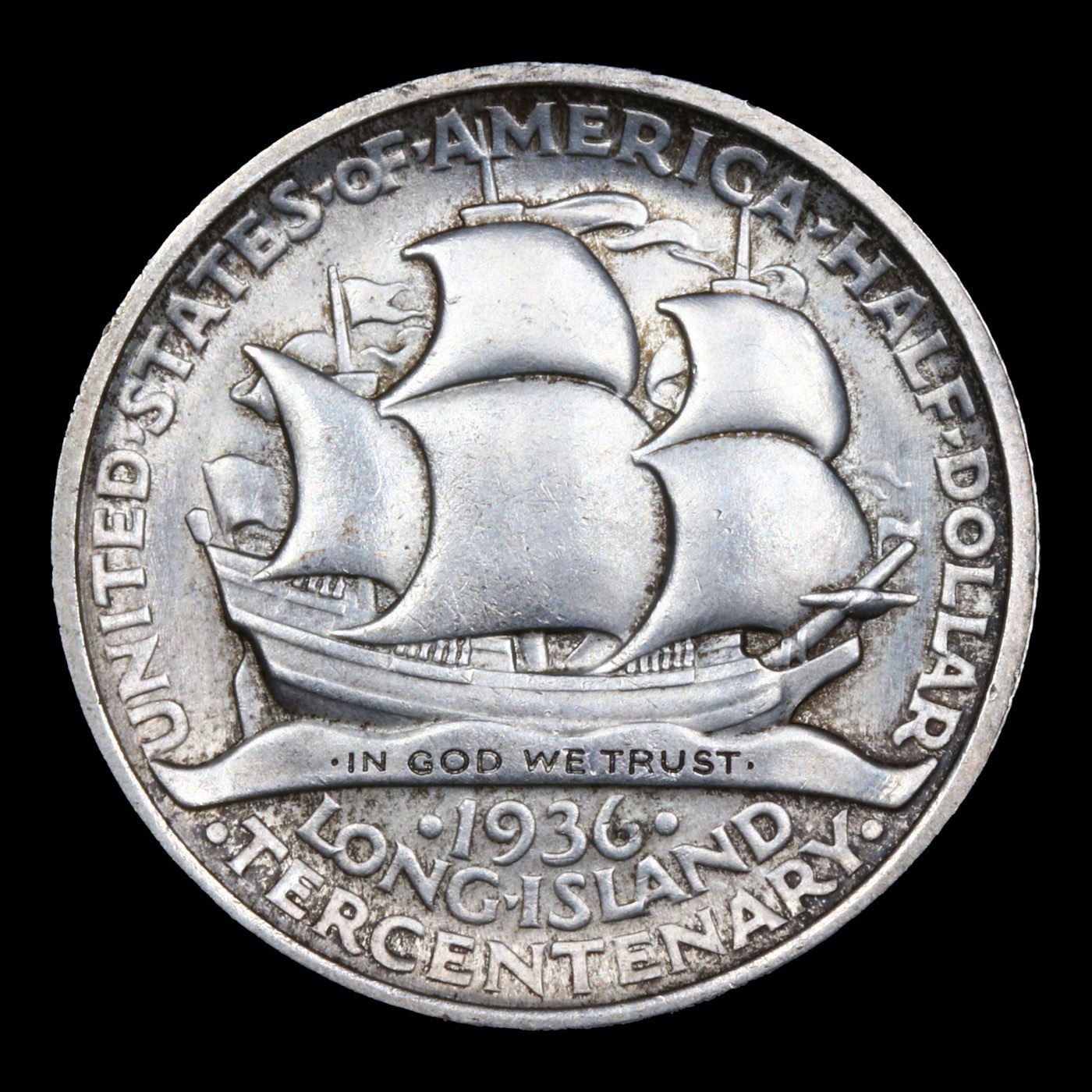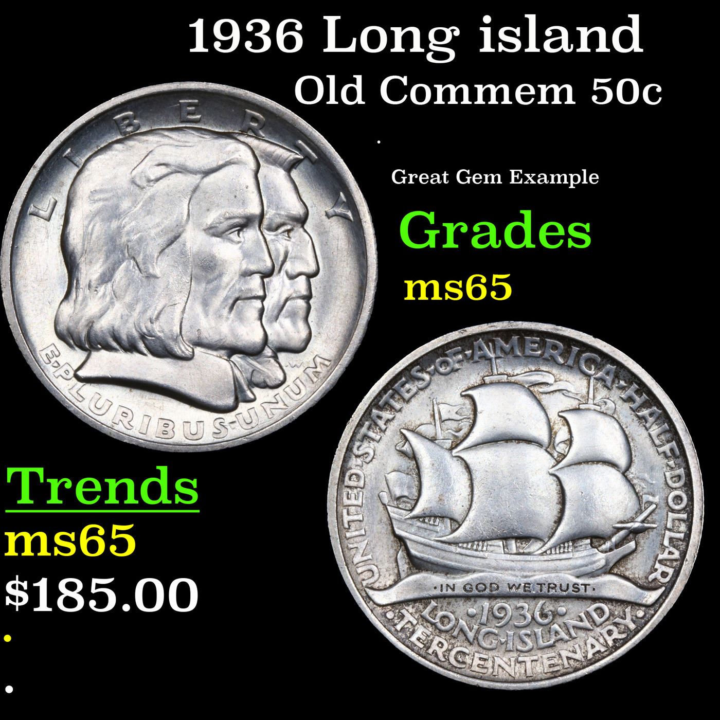 1936 Long island Old Commem Half Dollar 50c Grades GEM Unc. The Long Island Tercentenary half dollar was a commemorative half dollar struck by the United States Bureau of the Mint in 1936 at the height of the 1930s commemorative craze. There were 100,053 pieces minted.. The obverse depicts a male Dutch settler and an Algonquian tribesman, and the reverse shows a Dutch sailing ship. It was designed by Howard Weinman, the son of Mercury dime designer Adolph A. Weinman.The Long Island Tercentenary Committee wanted a coin to mark the 300th anniversary of the first European settlement there, at modern Flatlands, Brooklyn, New York City. The authorizing bill passed through Congress without opposition. Still, it was amended in the Senate to add protections against past commemorative coin abuses, such as low mintages or an assortment of varieties. On April 13, 1936, the bill became law with the signature of President Franklin D. Roosevelt.Most Long Islands are mint state, with the average grade being MS63 to MS65. Superb Gem MS66 examples are fairly difficult to obtain. But MS67 examples are definitely rare. This is probably due to the fact that both the obverse and reverse designs are somewhat flat and marks and abrasions are fairly common. Most Long Islands have frosty luster