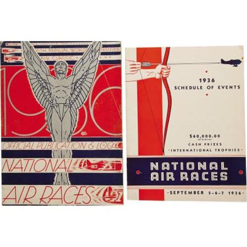 <B>1936 Los Angeles National Air Races Programs.</B></I> This lot includes a copy of the official publication and log for the National Air Races held in Los Angeles September 5-7, 1936, 9” x 12”, 56 pages, staple bound, paper covers, illustrated, wear to the cover, else very good; and a schedule of events for the race, 8.5” x 11”, 12 pages, staple bound, paper covers, in fine condition. <I>From the collection of Cliff Henderson.</B></I><BR><BR><b>Shipping:</b> Books & Catalogs (<a target="_blank" href="http://www.heritageauctions.com/common/shipping.php">view shipping information</a>)