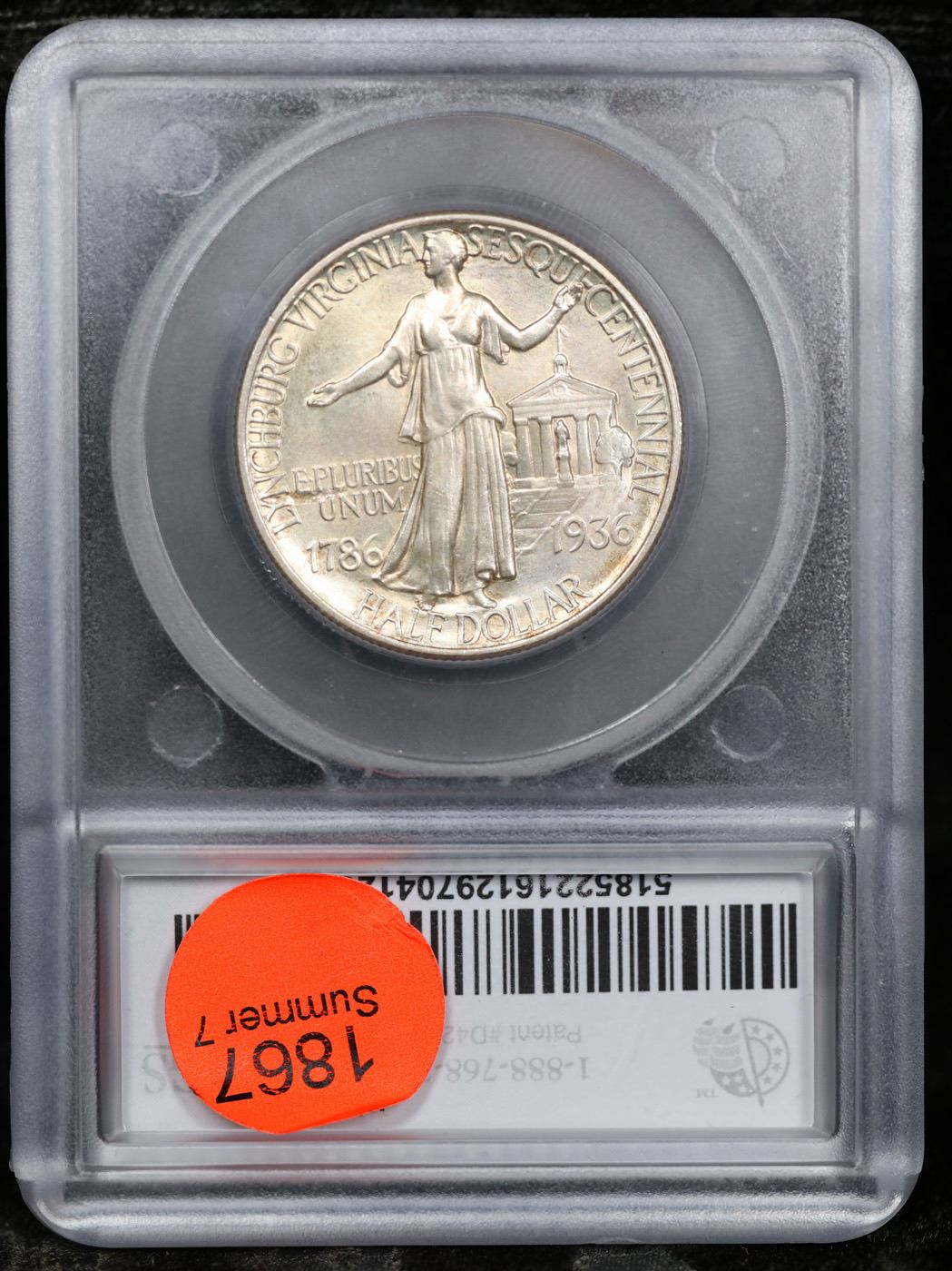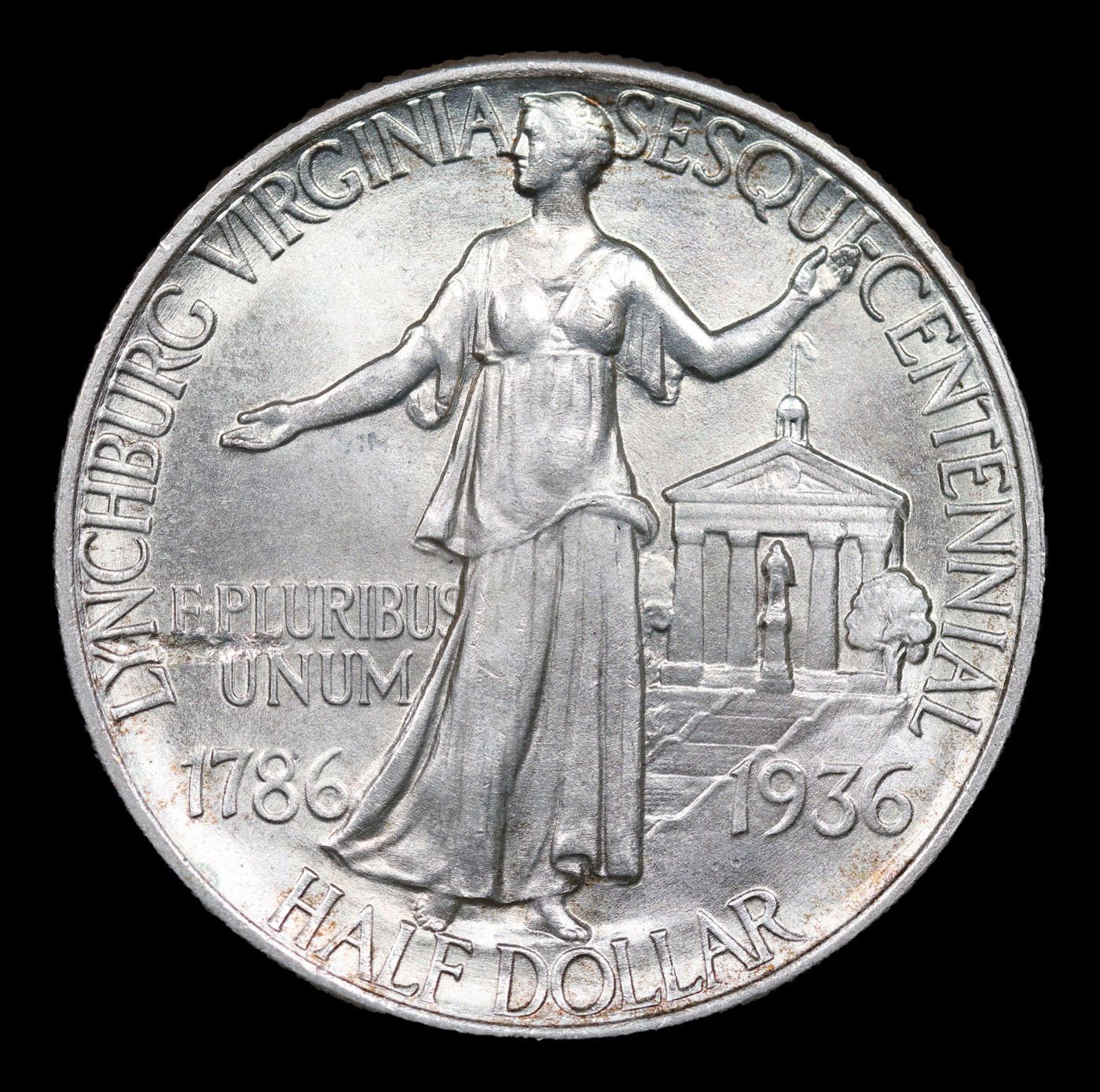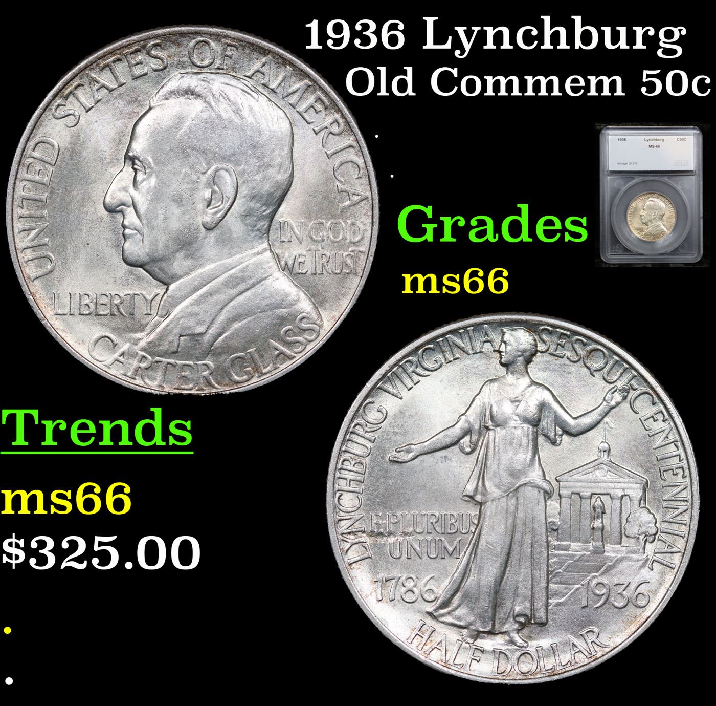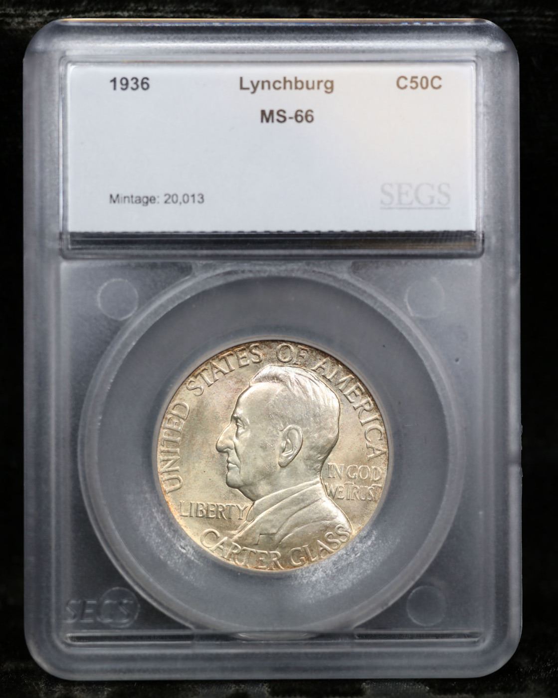 1936 Lynchburg Old Commem Half Dollar 50c Graded ms66 BY SEGS. The Commemorative was Struck Honoring the Sesquicentennial, or 150th Anniversary of Lynchburg, Virginia. This Issue is Often Found Not Fully Struck, the Highpoints of its Design looking Grainy as the result of Planchet’s Natural Texture still being in evidence. By Not Filling the Dies, this Texture was left intact. Areas in which to look for weakness are Liberty’s Head and Her Thigh, near the Motto 'E PLURIBUS UNUM'. Wear, if any, will First Appear on the Senator’s Hair Above His Ear, also on Liberty’s Head and Chest.