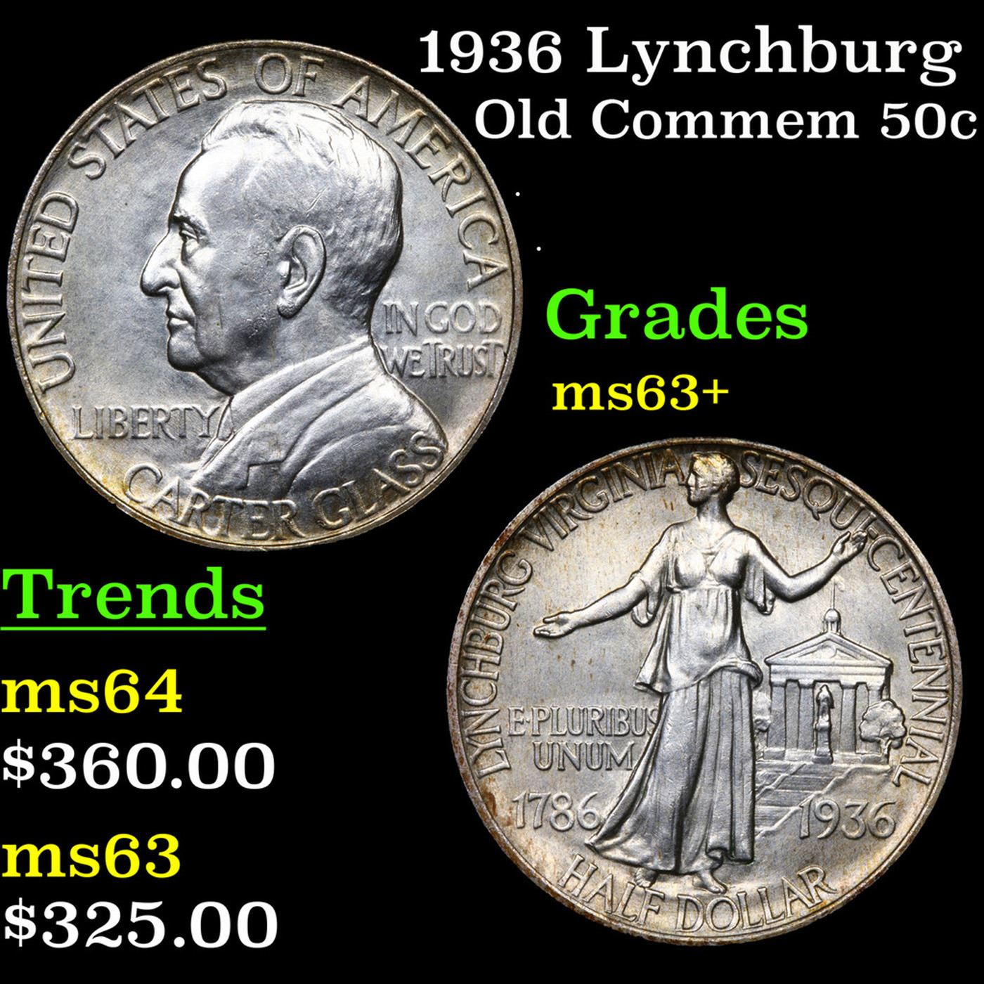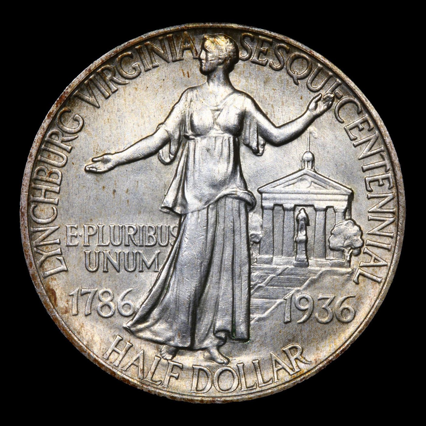 1936 Lynchburg Old Commem Half Dollar 50c Grades Select+ Unc. The Commemorative was Struck Honoring the Sesquicentennial, or 150th Anniversary of Lynchburg, Virginia. This Issue is Often Found Not Fully Struck, the Highpoints of its Design looking Grainy as the result of Planchet’s Natural Texture still being in evidence. By Not Filling the Dies, this Texture was left intact. Areas in which to look for weakness are Liberty’s Head and Her Thigh, near the Motto 'E PLURIBUS UNUM'. Wear, if any, will First Appear on the Senator’s Hair Above His Ear, also on Liberty’s Head and Chest.
