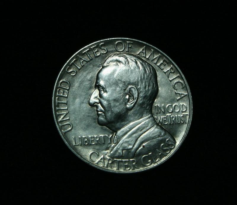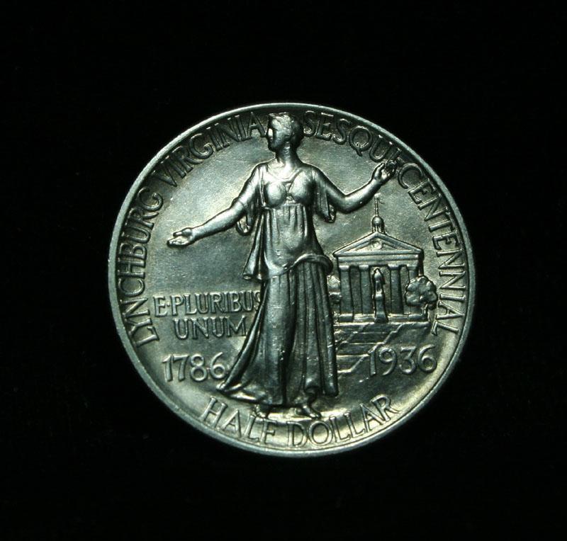 Nice white example. Good luster and average strike for the issue. The commemorative was struck honoring the sesquicentennial, or 150th anniversary of Lynchburg, Virginia. This issue is often found not fully struck, the highpoints of its design looking grainy as the result of planchet’s natural texture still being in evidence. By not filling the dies, this texture was left intact. Areas in which to look for weakness are Liberty’s head and her thigh, near the motto E PLURIBUS UNUM. Wear, if any, will first appear on the senator’s hair above his ear, also on Liberty’s head and chest. The Wholesale Greysheet lists ms64 at $210. Estimated Value $225