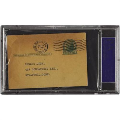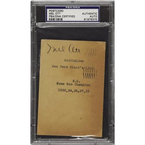 <B>1936 Mel Ott Signed Government Postcard.</B></I> The third man to enter the elite brotherhood of 500 home run hitters provides a 10/10 black fountain pen signature midway through a season that would see his New York Giants claim the National League pennant and face the Yanks in an historic Subway Series. The collector's typed notations are joined by postmark stamping on the autographed side, but none affects the signature in any regard. One of many government postcards from the collection of young Howard Lyon presented within this auction. Encapsulated by PSA/DNA for protection and unquestioned authenticity.<BR><BR><b>Shipping:</b> Sportscard (<a target="_blank" href="http://www.heritageauctions.com/common/shipping.php">view shipping information</a>)