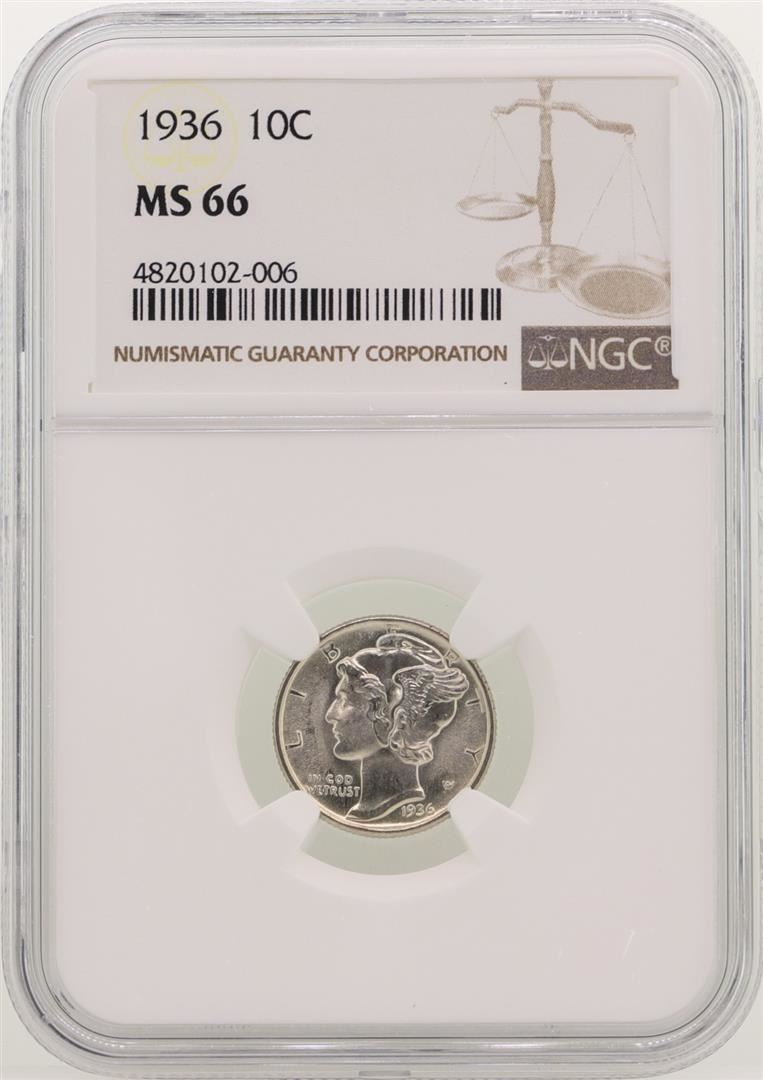 One 1936 Mercury Dime Coin NGC MS66. NGC Certified.