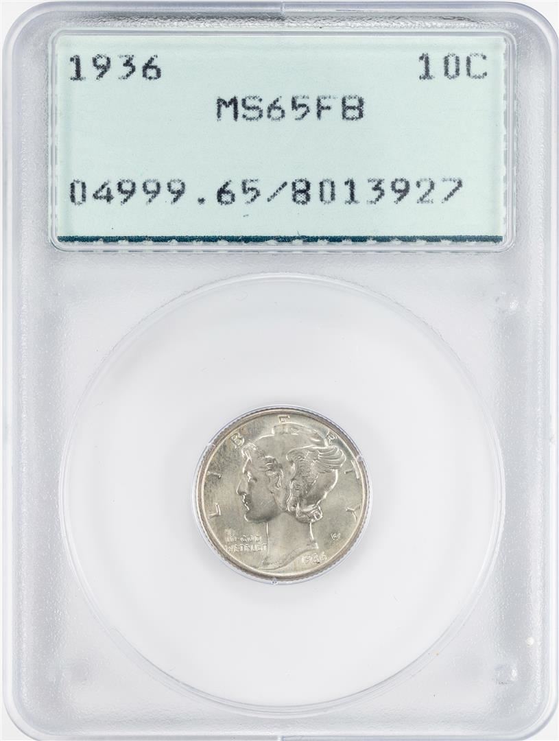 One 1936 Mercury Dime Coin PCGS MS65FB Old Green Rattler. PCGS Graded.