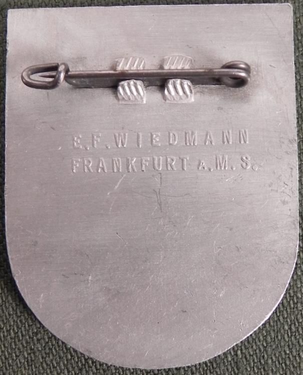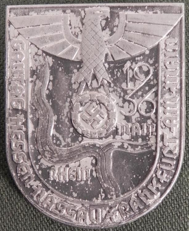 1936 NAZI MEDAL GAUTAG HESSEN W/LARGE EAGLE & SWASTIKA-MAKER:CF WIEDMANN * LARGE EARLY NAZI MEDAL- 1 3/4 X 1 1/2"--LARGE EAGLE & SWASTIKA OVER RHEIN & MAIN RIVER --READS "GAUTAG HESSEN NASSAU FRANKFURT AM MAIN" REVERSE "E F WIEDMANN-FRANKFORT AMS" *