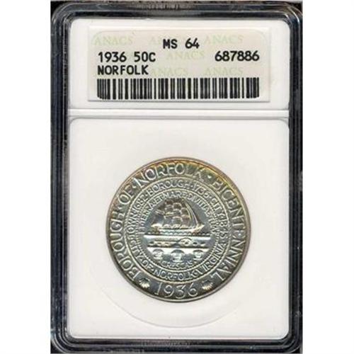 <b>1936 Norfolk Half Dollar. ANACS graded MS64.</b> Some light toning; well struck details on the concentric rings of wording, while at the center is a small sailing ship <b>(PCGS # 9337)</b>