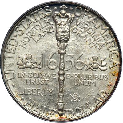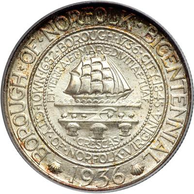 1936 Norfolk Half Dollar. PCGS graded MS-68. Near the edges there is lovely rainbow toning. A simply exquisite Gem of the Norfolk issue, the lustrous surfaces are overflowing with full, frosty textured mint bloom underneath the toning. Pop 142; none finer at PCGS. (PCGS # 9337).