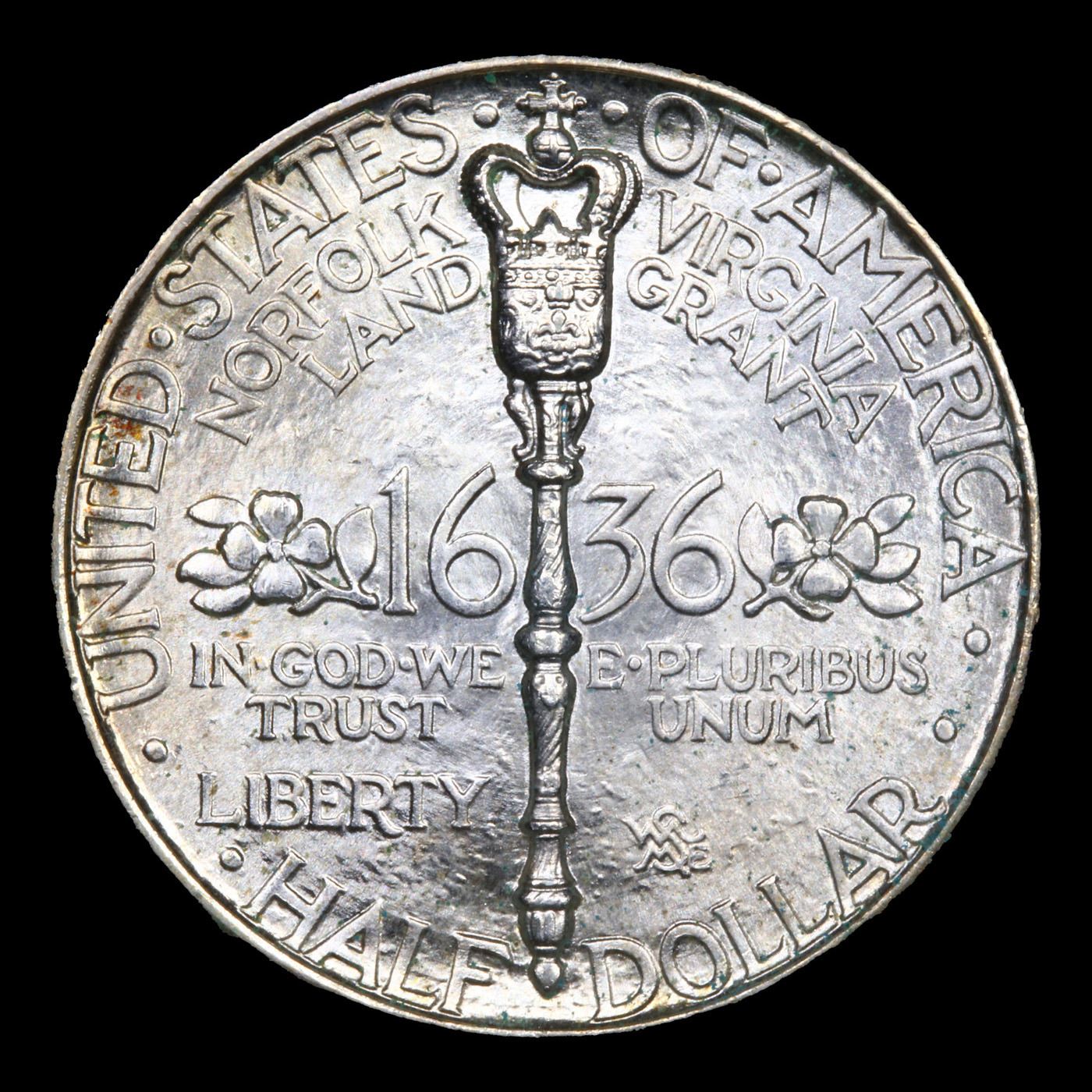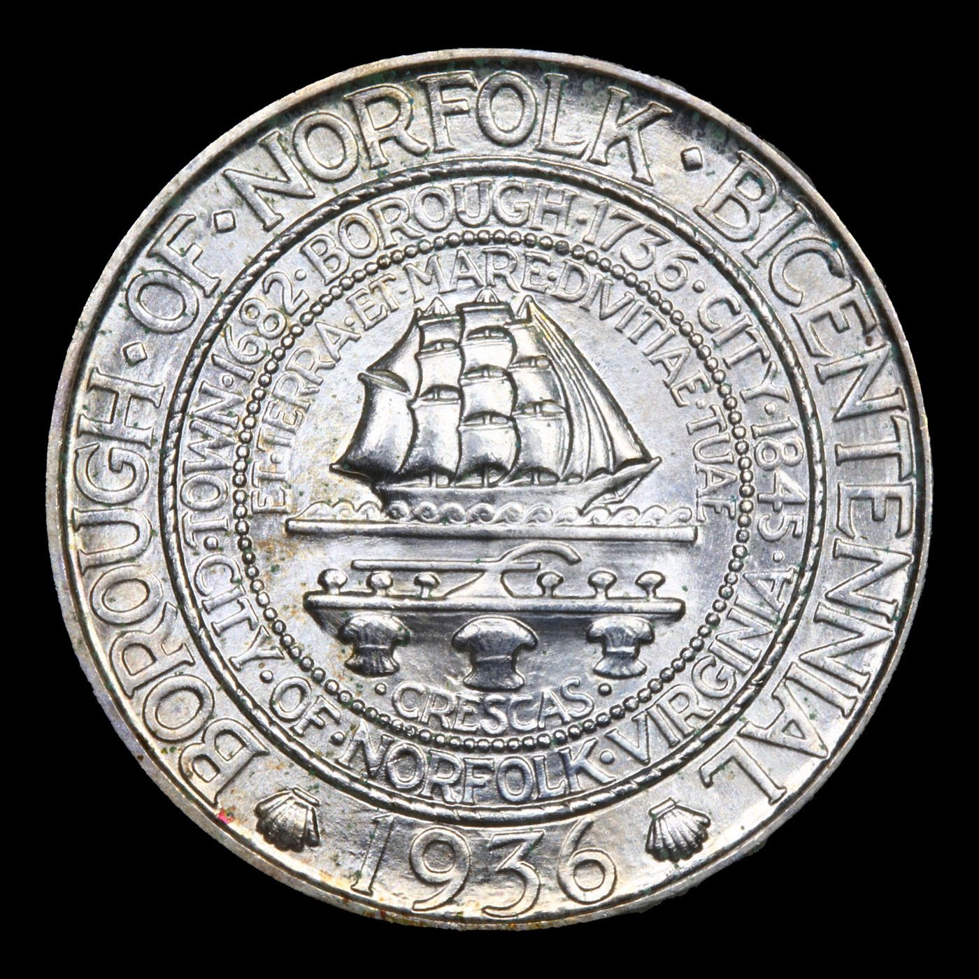1936 Norfolk Old Commem Half Dollar 50c Graded ms66 BY SEGS. The 1936 Norfolk Bicentennial Half Dollar was issued to commemorate the 200th anniversary of the establishment of Norfolk, Virginia as a borough. Both the obverse and reverse of the coins carry incredibly voluminous number of inscriptions, which dominate the design.At the center of the obverse is a reproduction of the Norfolk City Seal, which carries a ship plow and stocks of grain. Inscriptions are placed in three concentric circles surrounding this image. The inscriptions read “Borough of Norfolk Bicentennial”, “1936”, “City of Norfolk Virginia”, “Town 1682”, “Borough 1736”, “City 1845”, “Et Terra Et Mare Divitiae Tuae” (Both by Land and by Sea Thy Riches Are), and “Crescas” (Thou Shalt Grow).The reverse carries an image of the Royal Mace of Norfolk, which was presented by Lieutenant Governor Dinwiddie in 1753. The date “1636” appears at center with two floral sprays. As with the obverse, many inscriptions surround, reading “United States of America”, “Half Dollar”, “Norfolk Virginia Land Grant”, “In God We Trust”, “E Pluribus Unum”, and “Liberty”. Designs for the coin were prepared by William Marks Simpson and Marjorie Emory Simpson.This Commemorative marked an event of purely local interest, and realized poor sales at the time of issue. In the irony that often accompanies such initial failure, it is now among the Scarcer and More Costly Coins in the old commemorative series. This bill authorized the coining of not more than 25,000 half dollars, to be coined at a single mint and with a single design. The entire mintage of 25,013 Norfolk halves was coined in September at the Philadelphia Mint (the odd 13 pieces were reserved for assay and later destroyed). Points to check f