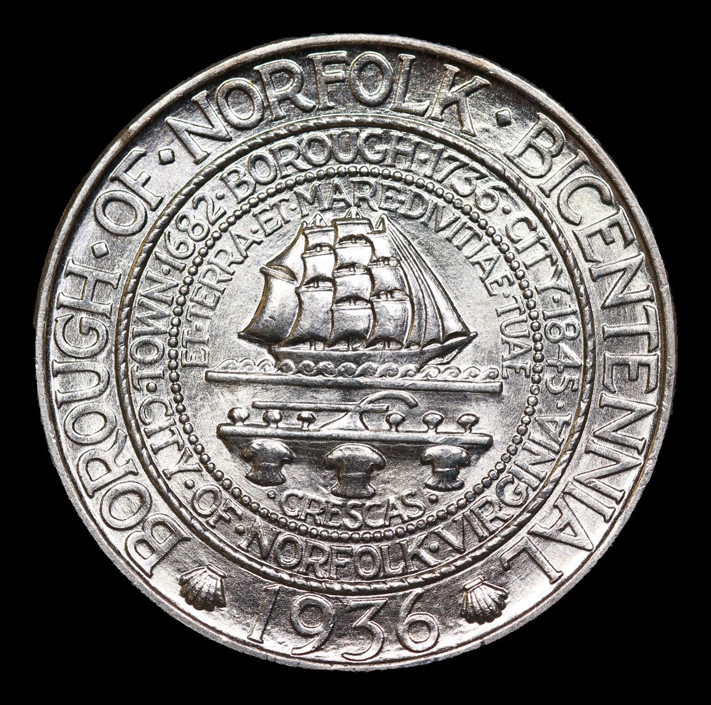 1936 Norfolk Old Commem Half Dollar 50c Grades GEM++ Unc. The 1936 Norfolk Bicentennial Half Dollar was issued to commemorate the 200th anniversary of the establishment of Norfolk, Virginia as a borough. Both the obverse and reverse of the coins carry incredibly voluminous number of inscriptions, which dominate the design.At the center of the obverse is a reproduction of the Norfolk City Seal, which carries a ship plow and stocks of grain. Inscriptions are placed in three concentric circles surrounding this image. The inscriptions read “Borough of Norfolk Bicentennial”, “1936”, “City of Norfolk Virginia”, “Town 1682”, “Borough 1736”, “City 1845”, “Et Terra Et Mare Divitiae Tuae” (Both by Land and by Sea Thy Riches Are), and “Crescas” (Thou Shalt Grow).The reverse carries an image of the Royal Mace of Norfolk, which was presented by Lieutenant Governor Dinwiddie in 1753. The date “1636” appears at center with two floral sprays. As with the obverse, many inscriptions surround, reading “United States of America”, “Half Dollar”, “Norfolk Virginia Land Grant”, “In God We Trust”, “E Pluribus Unum”, and “Liberty”. Designs for the coin were prepared by William Marks Simpson and Marjorie Emory Simpson.This Commemorative marked an event of purely local interest, and realized poor sales at the time of issue. In the irony that often accompanies such initial failure, it is now among the Scarcer and More Costly Coins in the old commemorative series. This bill authorized the coining of not more than 25,000 half dollars, to be coined at a single mint and with a single design. The entire mintage of 25,013 Norfolk halves was coined in September at the Philadelphia Mint (the odd 13 pieces were reserved for assay and later destroyed). Points to check f The 1936 Norfolk Bicentennial Half Dollar was issued to commemorate the 200th anniversary of the establishment of Norfolk, Virginia as a borough. Both the obverse and reverse of the coins carry incredibly voluminous number of inscriptions, which dominate the design.At the center of the obverse is a reproduction of the Norfolk City Seal, which carries a ship plow and stocks of grain. Inscriptions are placed in three concentric circles surrounding this image. The inscriptions read “Borough of Norfolk Bicentennial”, “1936”, “City of Norfolk Virginia”, “Town 1682”, “Borough 1736”, “City 1845”, “Et Terra Et Mare Divitiae Tuae” (Both by Land and by Sea Thy Riches Are), and “Crescas” (Thou Shalt Grow).The reverse carries an image of the Royal Mace of Norfolk, which was presented by Lieutenant Governor Dinwiddie in 1753. The date “1636” appears at center with two floral sprays. As with the obverse, many inscriptions surround, reading “United States of America”, “Half Dollar”, “Norfolk Virginia Land Grant”, “In God We Trust”, “E Pluribus Unum”, and “Liberty”. Designs for the coin were prepared by William Marks Simpson and Marjorie Emory Simpson.This Commemorative marked an event of purely local interest, and realized poor sales at the time of issue. In the irony that often accompanies such initial failure, it is now among the Scarcer and More Costly Coins in the old commemorative series. This bill authorized the coining of not more than 25,000 half dollars, to be coined at a single mint and with a single design. The entire mintage of 25,013 Norfolk halves was coined in September at the Philadelphia Mint (the odd 13 pieces were reserved for assay and later destroyed). Points to check f