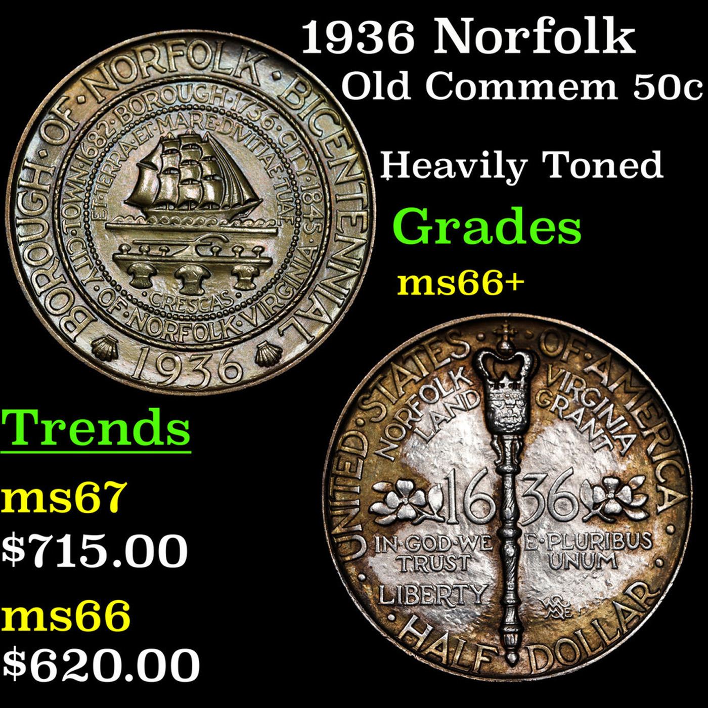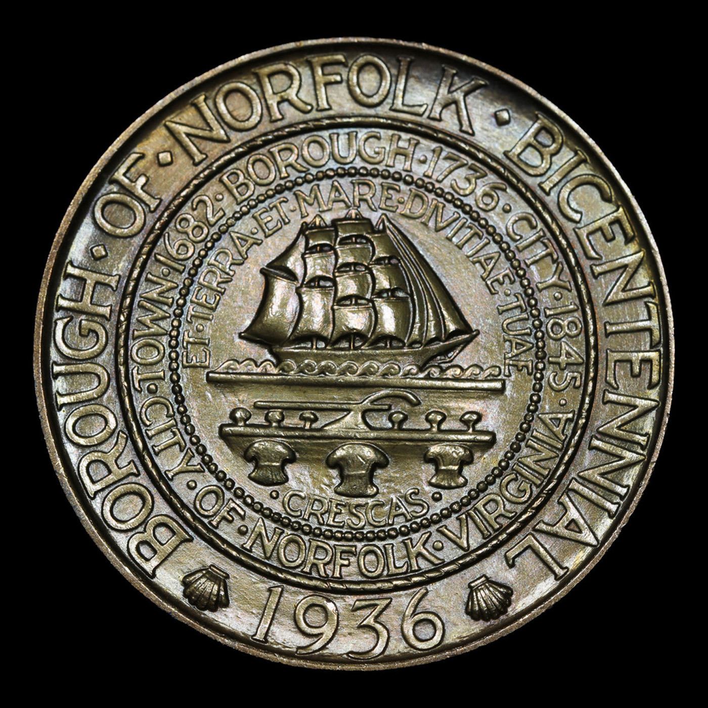 1936 Norfolk Old Commem Half Dollar 50c Grades GEM++ Unc. The 1936 Norfolk Bicentennial Half Dollar was issued to commemorate the 200th anniversary of the establishment of Norfolk, Virginia as a borough. Both the obverse and reverse of the coins carry incredibly voluminous number of inscriptions, which dominate the design.At the center of the obverse is a reproduction of the Norfolk City Seal, which carries a ship plow and stocks of grain. Inscriptions are placed in three concentric circles surrounding this image. The inscriptions read “Borough of Norfolk Bicentennial”, “1936”, “City of Norfolk Virginia”, “Town 1682”, “Borough 1736”, “City 1845”, “Et Terra Et Mare Divitiae Tuae” (Both by Land and by Sea Thy Riches Are), and “Crescas” (Thou Shalt Grow).The reverse carries an image of the Royal Mace of Norfolk, which was presented by Lieutenant Governor Dinwiddie in 1753. The date “1636” appears at center with two floral sprays. As with the obverse, many inscriptions surround, reading “United States of America”, “Half Dollar”, “Norfolk Virginia Land Grant”, “In God We Trust”, “E Pluribus Unum”, and “Liberty”. Designs for the coin were prepared by William Marks Simpson and Marjorie Emory Simpson.This Commemorative marked an event of purely local interest, and realized poor sales at the time of issue. In the irony that often accompanies such initial failure, it is now among the Scarcer and More Costly Coins in the old commemorative series. This bill authorized the coining of not more than 25,000 half dollars, to be coined at a single mint and with a single design. The entire mintage of 25,013 Norfolk halves was coined in September at the Philadelphia Mint (the odd 13 pieces were reserved for assay and later destroyed). Points to check f