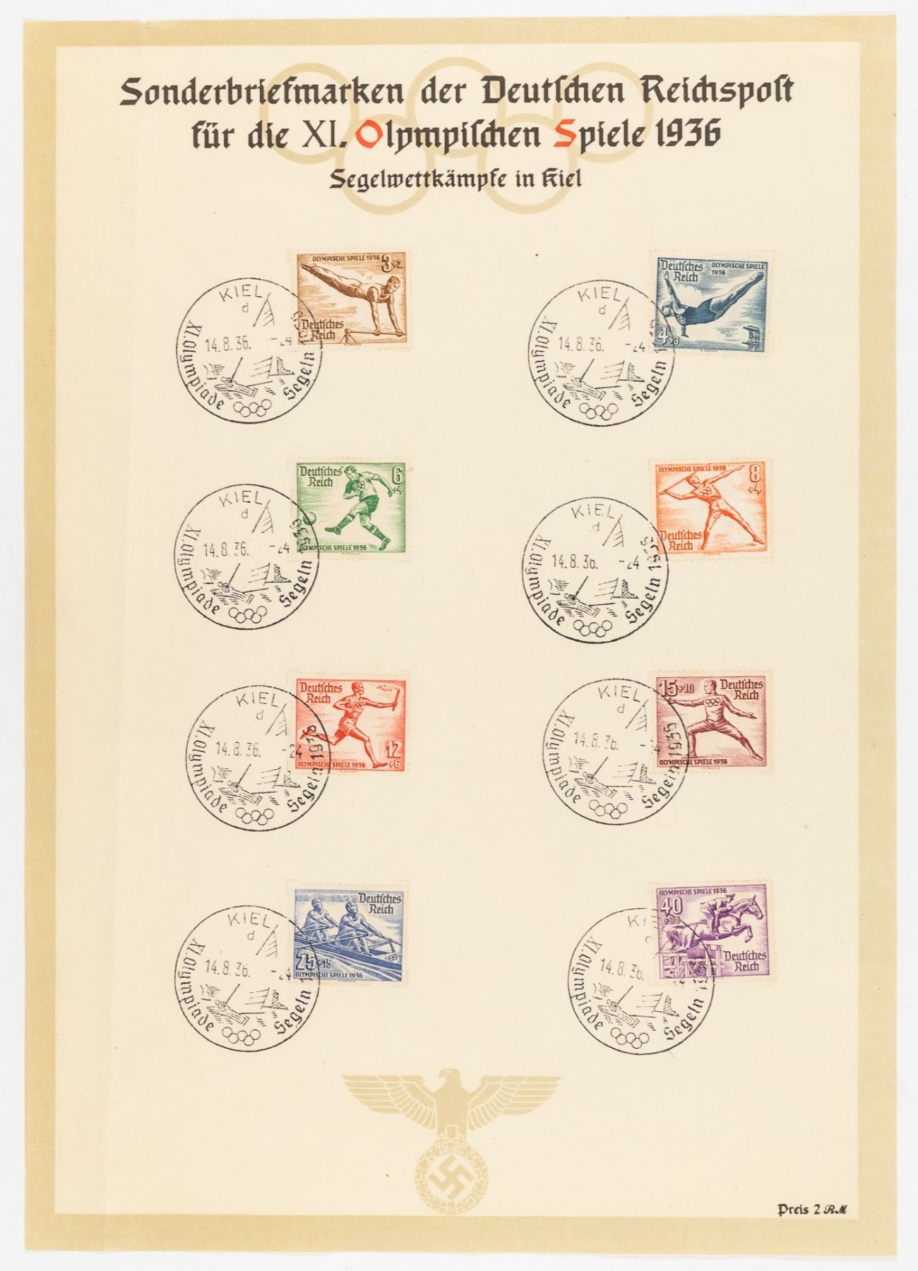 Set of eight German special postal stamps depicting various Olympic sports at the 1936 Berlin Summer Olympics, officially known as the Games of the XI. Olympiad. Cancellation stamp from Kiel, Germany, 14. August 1936.