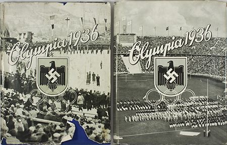 A superb pair of German yearbooks from the historic 1936 Olympics, each folio size and titled Olympia: Die Olympischen Spiel 1936 Vols. I (125pp.) and II (164pp). Bound in bright blue linen with embossed titles, each volume is meticulously illustrated with original b/w and color photos of the athletes, crowd scenes, etc. affixed to nearly every page. With original dustjackets, which have moderate wear and loss to edges. Crude tape repairs to spine of Vol. 1, with Vol. 2 in much better condition. Interior clean on each, however. Two volumes.