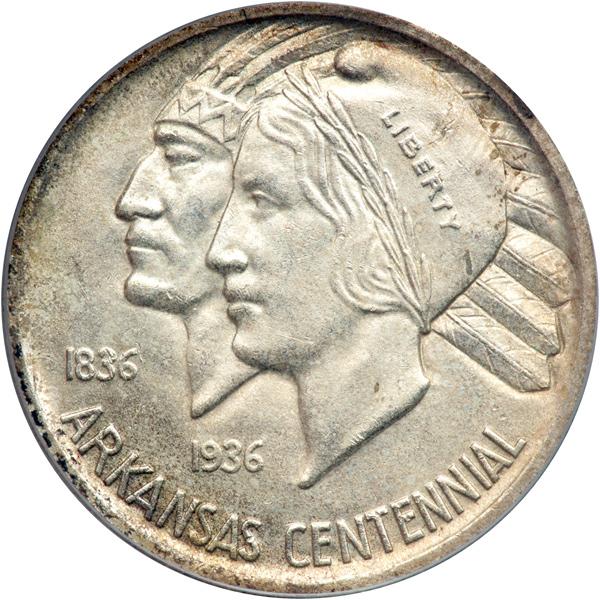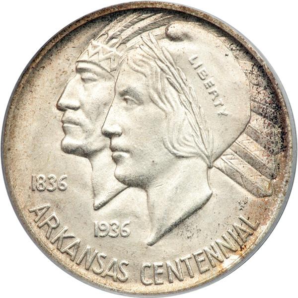 1936-P,D,S Arkansas Half Dollar Set. Each PCGS graded as follows: MS-63, MS-64 and PVC Residue (our grade is MS-60+). Lot of 3 coins.