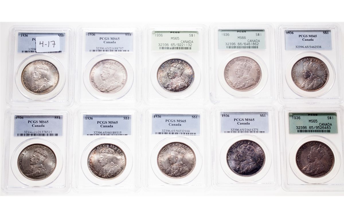1936. PCGS graded Mint State-65. Lot of ten (10) superb hand selected Gems, each with light to medium rainbow toning and outstanding 'eye-appeal'. A final outstanding half roll of Gem silver dollars.