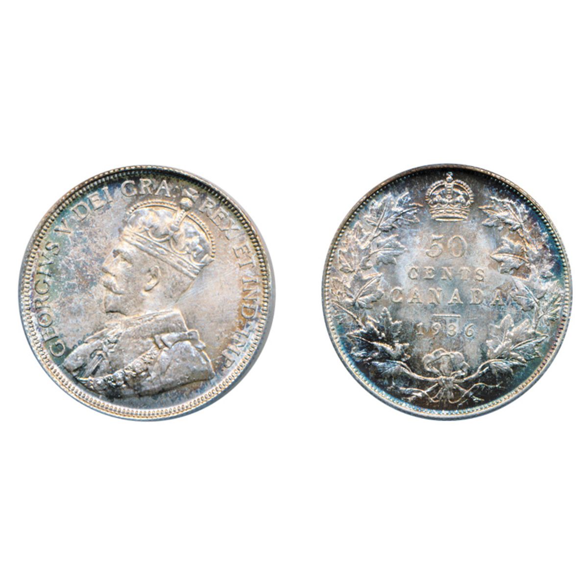 1936. PCGS graded Mint State-66. Lightly toned with rainbow, multi-hued toning.