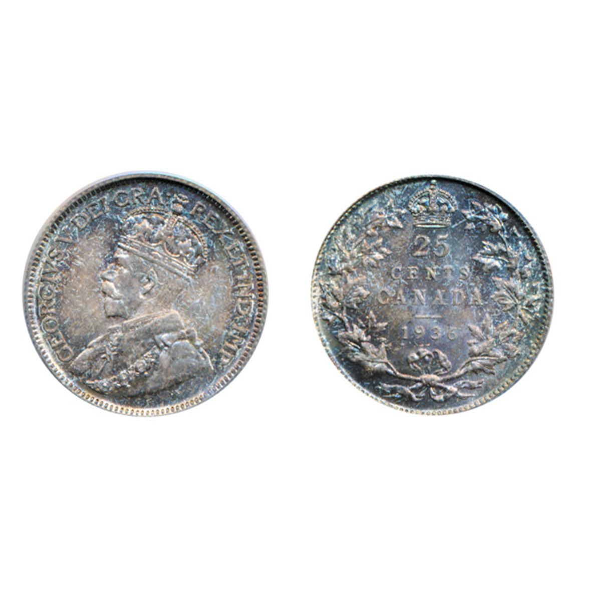 1936. PCGS graded Mint State-67. Medium heavy pearl toning, with outstanding rainbow highlights. The ‘Finest’ graded by PCGS.