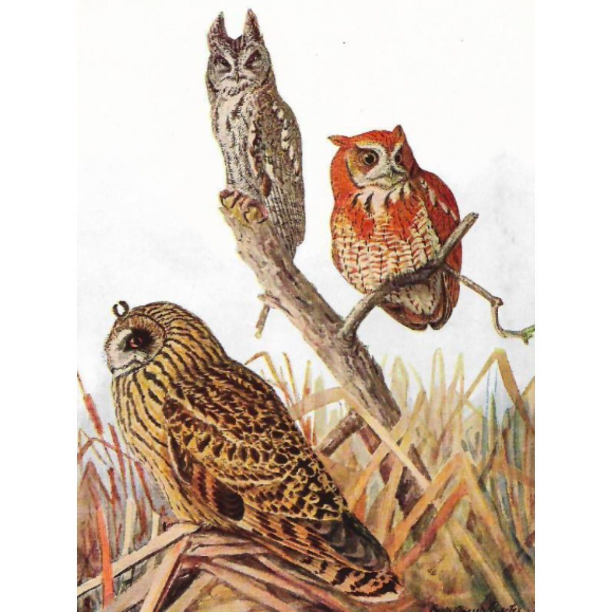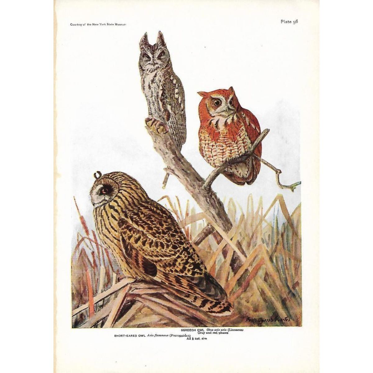1936 Pearson Birds, #55 Owls (Screech, Short-Eared). 8"x11" Comes with mat board. Birds of America. T. Gilbert Pearson, Editor-in-Chief, Garden City Publishing Co., Inc. c1936. Photos courtesy of the New York State Museum. "There have been recorded in North America eight hundred distinct species of wild birds, and four hundred additional subspecies, or climatic varieties. This refers to the territory lying north of the Rio Grande. "When the present work on Birds of America was projected, we felt that the time was at last ripe for a new book on the subject that should be a final repository of all the vast treasure of scattered information. What was clearly needed, was to make a thorough canvass of the field and produce a work at once popular and scientific, and at the same time comprehensive -- a record of our wild birds. The official check list of the American Ornithologists' Union has been followed for classification. We have tried, in a word, to present a complete picture and story of our feathered wild bird life." ..T. Gilbert Pearson, President of the National Assoc. of Audubon Societies.
