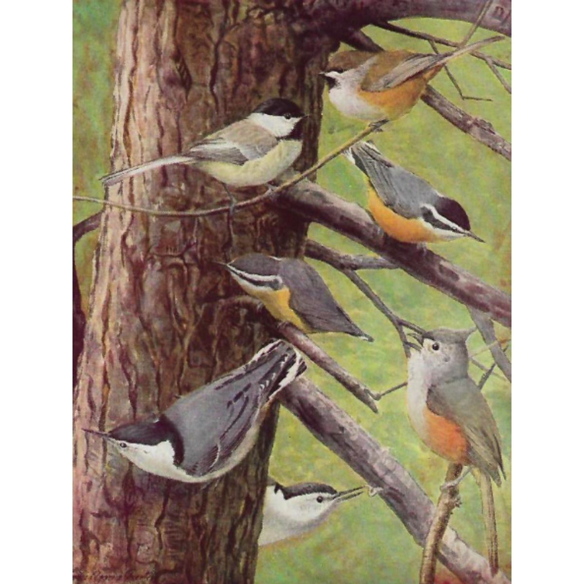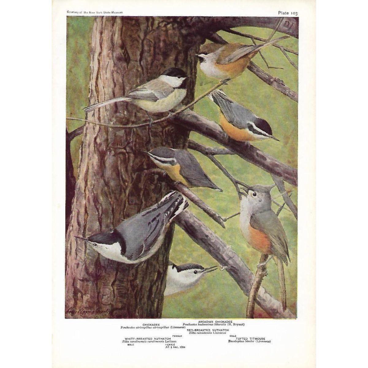 1936 Pearson Birds, #7 Chickadee (&Arcadian) - Nuthatch (Red-Breasted, White-Breasted) - Tufted Titmouse. 8"x11" Comes with mat board. Birds of America. T. Gilbert Pearson, Editor-in-Chief, Garden City Publishing Co., Inc. c1936. Photos courtesy of the New York State Museum. "There have been recorded in North America eight hundred distinct species of wild birds, and four hundred additional subspecies, or climatic varieties. This refers to the territory lying north of the Rio Grande. "When the present work on Birds of America was projected, we felt that the time was at last ripe for a new book on the subject that should be a final repository of all the vast treasure of scattered information. What was clearly needed, was to make a thorough canvass of the field and produce a work at once popular and scientific, and at the same time comprehensive -- a record of our wild birds. The official check list of the American Ornithologists' Union has been followed for classification. We have tried, in a word, to present a complete picture and story of our feathered wild bird life." ..T. Gilbert Pearson, President of the National Assoc. of Audubon Societies.