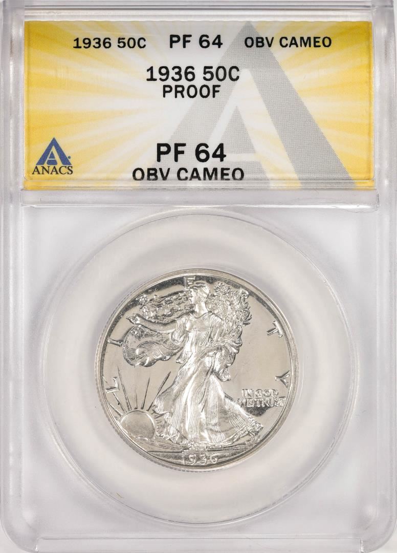 One 1936 Proof Walking Liberty Half Dollar Coin ANACS PF64 Obverse Cameo. ANACS Certified.