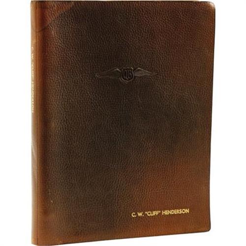<B>Spectacular 1936 “Quiet Birdmen” Pilot Portrait Album.</B></I> Privately produced and published by the Quiet Birdmen, a fraternal organization of pilots founded in 1921 by Harvey Mummert and Harry Bruno, this album contains 141 pages of black-and-white photo portraits of member pilots. The portraits contained constitute a veritable “who's who” of early aviation: Eddie Rickenbacker, Charles Lindbergh, Clyde Pangborn, Ernst Udet, Jimmy Doolittle, Roscoe Turner, and over 500 other pilots, many who have become household names. This is the personal copy of Clifford Henderson, an aviation entrepreneur and executive director of the National Air Races. As such, several of the portraits have been signed or inscribed to him. The portraits are contained in an attractive grained-leather binder, 9” x 11.5”, with an embossed Quiet Birdmen logo on the front cover and Henderson's name stamped in gilt on the cover and spine. Bound in front is a printed subscription letter containing information on how to submit photos for publication in the album and purchasing information. Included with the album is a brass Quiet Birdmen membership card, 2.25” x 4”, in a leather case. The membership card belonged to Phil Henderson, Cliff's brother and business partner in several family business ventures. The album cover is slightly worn but the internal contents are sound and in near fine condition. <I>From the collection of Cliff Henderson.</B></I><BR><BR><b>Shipping:</b> Books & Catalogs (<a target="_blank" href="http://www.heritageauctions.com/common/shipping.php">view shipping information</a>)