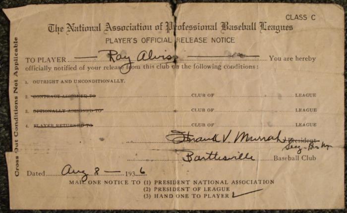 Here's something you don't see everyday. This The National Association of Professional Baseball Leagues Player's Official Release Notice (Class C) was written appearantly for Ray Alviss. The condition for this release was done outright and unconditionally; the other three conditions have been crossed out. It has been signed by a league official of the what looks like the Bartlesville Baseball Club. It was dated August 8th, 1936 and to be handed directly to this player. On the back there appears to be part of some woman's address and part of a note addressed to someone else. It is in fair condition and shows wear with some tearing and smudge marks.