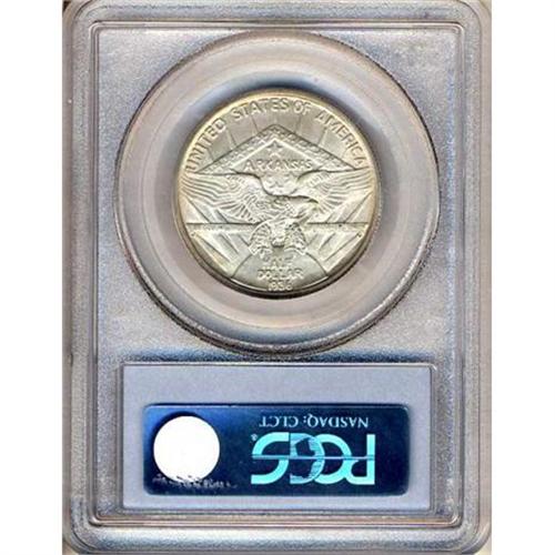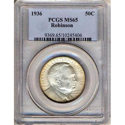 <b>1936 Robinson-Arkansas Half Dollar. PCGS graded MS65.</b> Delicately toned. Swirls of silvery cartwheel luster with richer texture than average for a Robinson <b>(PCGS # 9369)</b> <i>