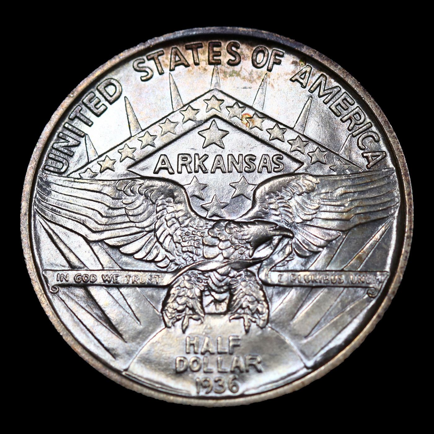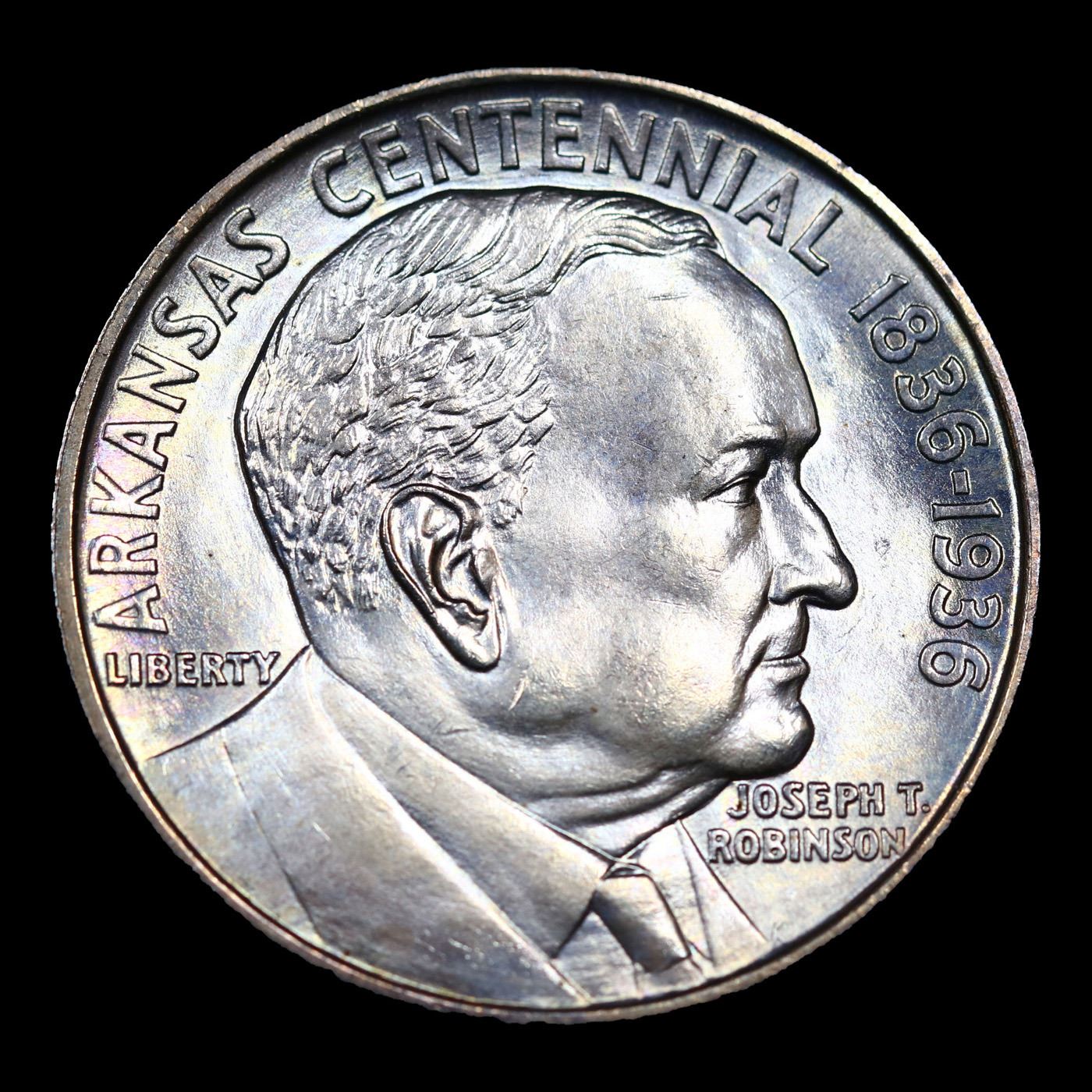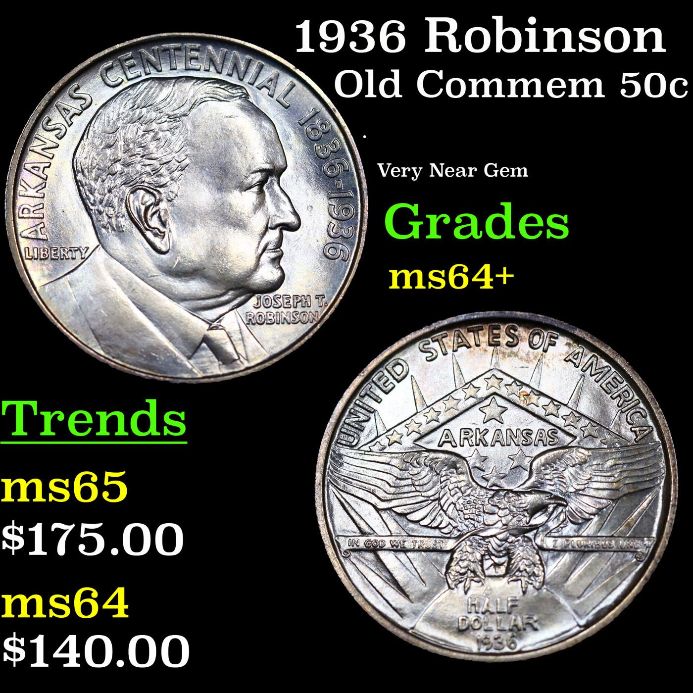 1936 Robinson Old Commem Half Dollar 50c Grades Choice+ Unc. The Robinson-Arkansas Commemorative was a much maligned Commemorative, this Issue is Nowadays Sought After as much as the others. The Issue is Generally Weakly Struck and has Luster which looks more Satin than Bright. When examining an Robinson-Arkansas for wear, check Miss Liberty’s Cheek and Wreath, also the Eagle’s Head and Right Wing - these are the High Points. The typical Robinson-Arkansas Half Dollar will show extensive contact marks and abrasions on the Senator’s face.