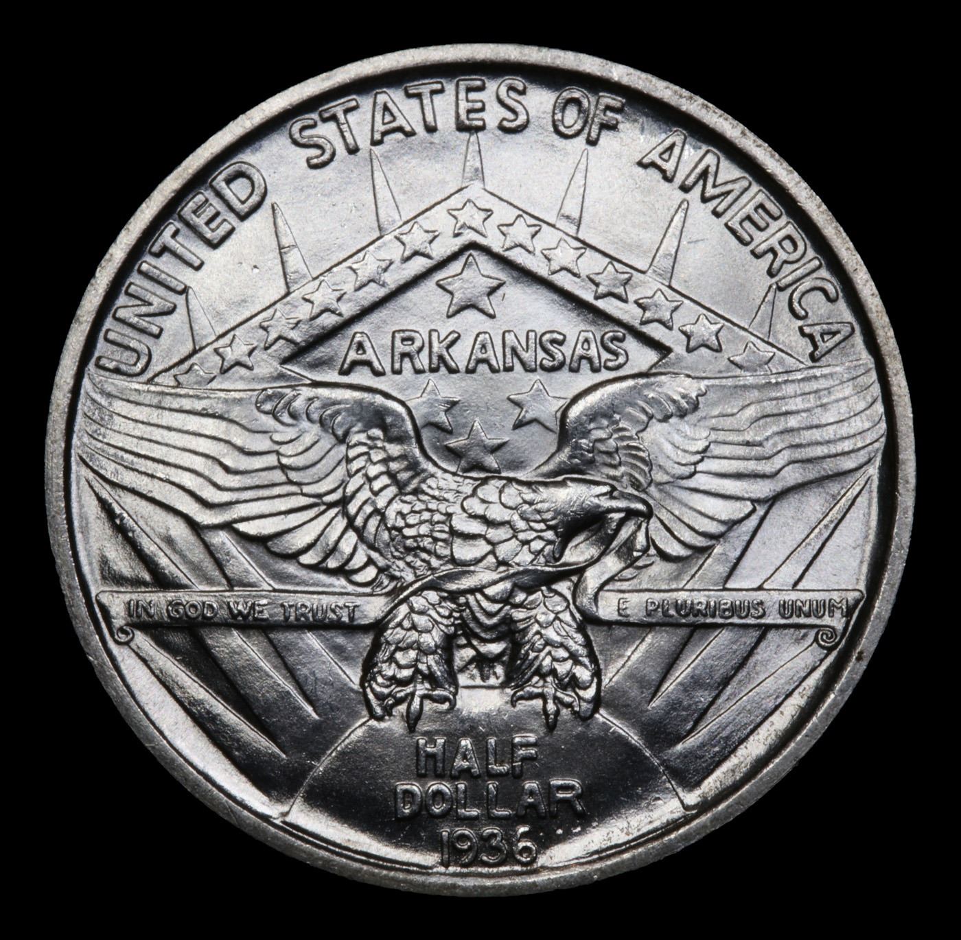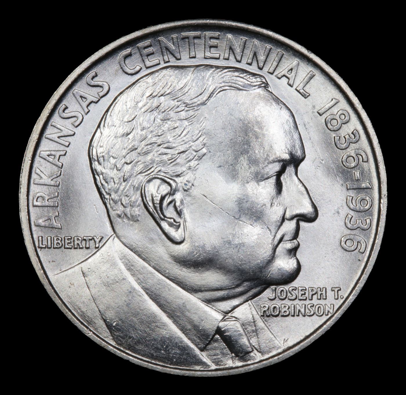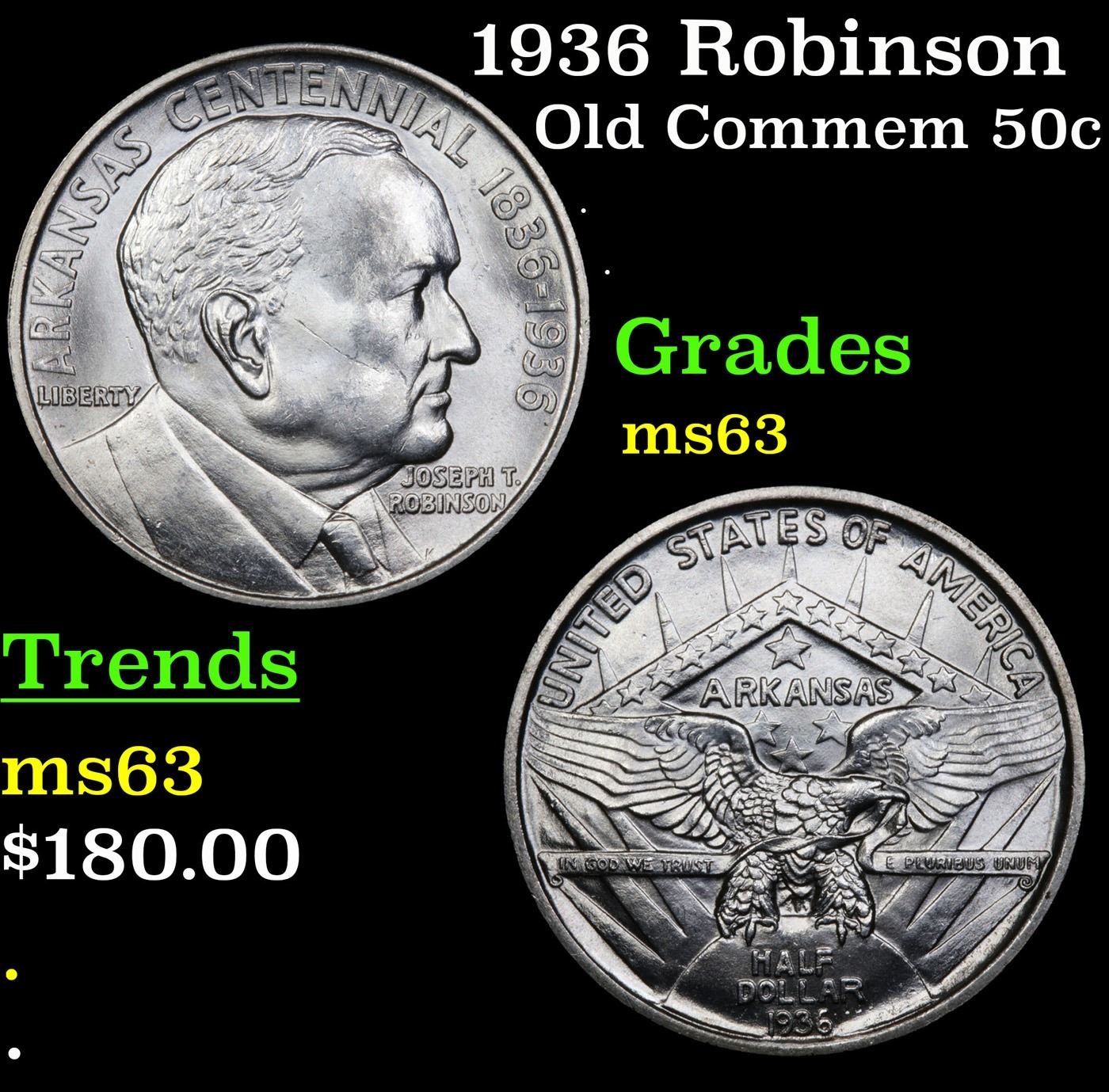 1936 Robinson Old Commem Half Dollar 50c Grades Select Unc. The Robinson-Arkansas Commemorative was a much maligned Commemorative, this Issue is Nowadays Sought After as much as the others. The Issue is Generally Weakly Struck and has Luster which looks more Satin than Bright. When examining an Robinson-Arkansas for wear, check Miss Liberty’s Cheek and Wreath, also the Eagle’s Head and Right Wing - these are the High Points. The typical Robinson-Arkansas Half Dollar will show extensive contact marks and abrasions on the Senator’s face.