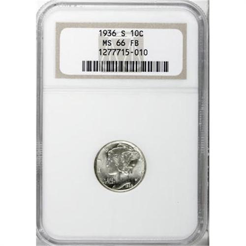 <B>1936-S 10C MS66 Full Bands NGC.</B></I> NGC Census: (309/52). PCGS Population (567/139). Mintage: 9,210,000. Numismedia Wsl. Price for NGC/PCGS coin in MS66: $112. (#5003)<BR><BR><B>Coin Engraver:</B> Adolph A. Weinman<BR><BR><b>Shipping:</b> Coins & Currency (<a target="_blank" href="http://www.heritageauctions.com/common/shipping.php">view shipping information</a>)