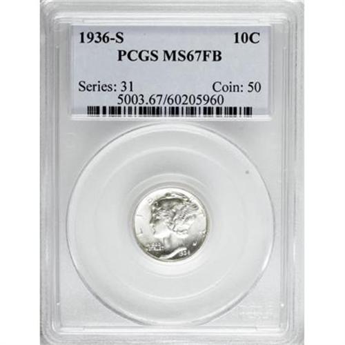 <B>1936-S 10C MS67 Full Bands PCGS.</B></I> PCGS Population (131/2). NGC Census: (51/1). Mintage: 9,210,000. Numismedia Wsl. Price for NGC/PCGS coin in MS67: $625. (#5003)<BR><BR><B>Coin Engraver:</B> Adolph A. Weinman<BR><BR><b>Shipping:</b> Coins & Currency (<a target="_blank" href="http://www.heritageauctions.com/common/shipping.php">view shipping information</a>)