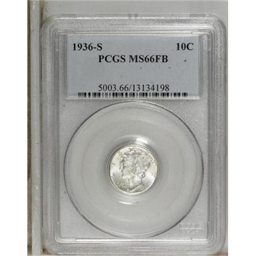 <B>1936-S 10C MS66 Full Bands PCGS.</B></I> PCGS Population (549/133). NGC Census: (302/51). Mintage: 9,210,000. Numismedia Wsl. Price for NGC/PCGS coin in MS66: $105. (#5003)<BR><BR><b>Shipping:</b> Coins & Currency (<a target="_blank" href="http://www.heritageauctions.com/common/shipping.php">view shipping information</a>)