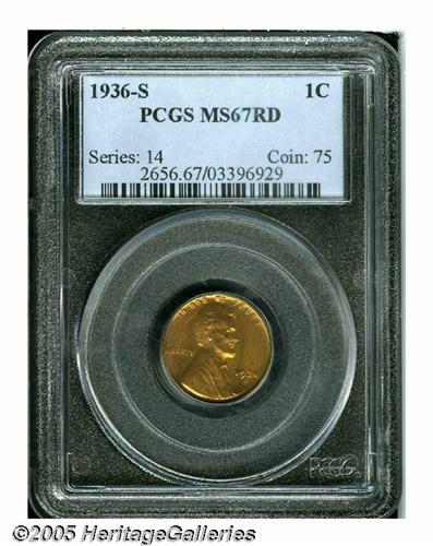 <B>1936-S<1C> MS67 Red PCGS.</B></I> Although certainly not a scarce coin in an absolute sense, problem-free Gem examples are scarce, and even high grade examples are often found with muted toning, weak strikes, or distracting spotting and discoloration. The present specimen exhibits none of these problems, with bright, softly glowing orange-gold color over nearly pristine creamy surfaces. Well struck overall and having only miniscule abrasions as expected for the grade. A small toning spot is noted near the lower left wheat stalk. Population: 27 in 67, 0 finer (3/05).<BR><I>From The Tom Mershon #2 All-Time PCGS Registry Set of Lincoln Wheat Cents.</B></I>