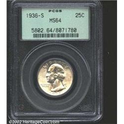 1936-S 25C MS64 PCGS. Mintage: 3,828,000. The latest Coin World "Trends" price is $100.00. The current Coin Dealer Newsletter (Greysheet) wholesale "bid" price is $90.00.