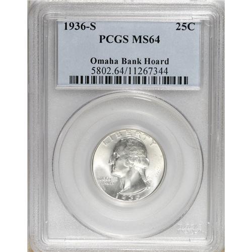 <B>1936-S 25C MS64 PCGS.</B></I> Ex: Omaha Bank Hoard. PCGS Population (776/905). NGC Census: (307/498). Mintage: 3,828,000. Numismedia Wsl. Price: $160. (#5802)<BR><BR><b>Shipping:</b> Coins & Currency (<a target="_blank" href="http://www.heritageauctions.com/common/shipping.php">view shipping information</a>)