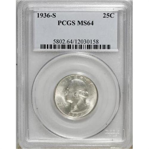 <B>1936-S 25C MS64 PCGS.</B></I> PCGS Population (761/1104). NGC Census: (333/524). Mintage: 3,828,000. Numismedia Wsl. Price for NGC/PCGS coin in MS64: $130. (#5802)<BR><BR><B>Coin Engraver:</B> John Flanagan<BR><BR><b>Shipping:</b> Coins & Currency (<a target="_blank" href="http://www.heritageauctions.com/common/shipping.php">view shipping information</a>)