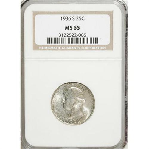 <B>1936-S 25C MS65 NGC.</B></I> NGC Census: (366/146). PCGS Population (725/357). Mintage: 3,828,000. Numismedia Wsl. Price for NGC/PCGS coin in MS65: $300. (#5802)<BR><BR><B>Coin Engraver:</B> John Flanagan<BR><BR><b>Shipping:</b> Coins & Currency (<a target="_blank" href="http://www.heritageauctions.com/common/shipping.php">view shipping information</a>)