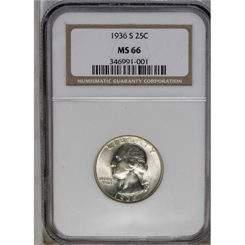 1936-S 25C MS66 NGC. Well struck with attractive, lust 1936-S