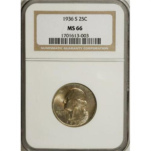 <B>1936-S 25C MS66 NGC.</B></I> NGC Census: (147/14). PCGS Population (312/21). Mintage: 3,828,000. Numismedia Wsl. Price for NGC/PCGS coin in MS66: $420. (#5802)<BR><BR><B>Coin Engraver:</B> John Flanagan<BR><BR><b>Shipping:</b> Coins & Currency (<a target="_blank" href="http://www.heritageauctions.com/common/shipping.php">view shipping information</a>)