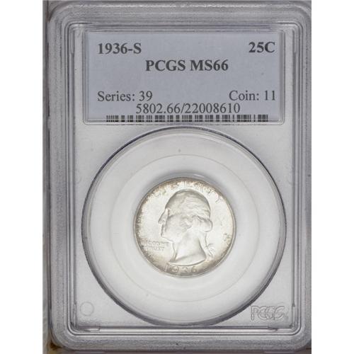 1936-S 25C MS66 PCGS. Radiantly lustrous surfaces disp 1936-S[25C] MS66 PCGS.