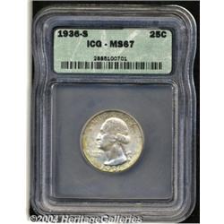 <B>1936-S<25C> MS67 ICG.</B></I> Freckled gold, lime-green, rose, and steel-blue colors endow this lustrous and compelling Superb Gem. A boldly struck example that has an especially clean reverse. With a production below 4 million pieces, the 1936-S is among the lowest mintage issues of the series. <BR><BR><B>Important notice:</B> Heritage usually auctions material at the rate of 200-250 lots per hour. On some occasions eBay Live bid software or the Internet may not be able to keep up with the pace of the auction. We recommend placing a realistic absentee bid now as insurance to avoid disappointment. Occasionally the auctioneer may eliminate or reject an eBay Live bid, and the auctioneer may also reopen a lot after the close of the eBay live bidding (usually because we missed an audience bid), and may reject your bid even if it shows you as the winning bidder. By bidding via eBay Live, you agree that Heritage may award the lot to another bidder at its sole discretion under the circumstances described above or any other reasonable circumstances. Since eBay bids are not shown to us until we open the lot on the floor, we treat those bids just like floor bids. In most cases the floor responds before the eBay bid is presented to us, due to Internet lag time, so for consistency we have made it a policy that floor bids are always considered first over tie eBay live bids. Also please note that all Heritage lots purchased through eBay Live carry a 20% Buyer's Premium. Please make sure you read the Terms and Conditions before you bid. </span></font></tr></table></td></tr></table>
