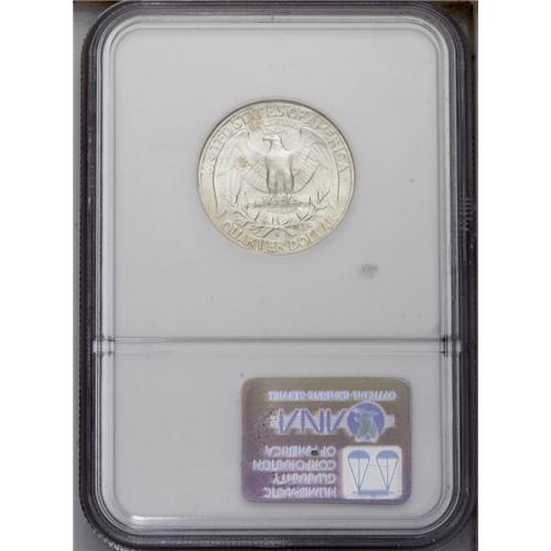 <B>1936-S<25C> MS67 NGC.</B></I> The 1936-S, with a mintage of 3,828,000 pieces, boasts the eleventh lowest mintage in the Washington quarter series. A fair number of survivors have been certified at the near-Gem and Gem levels by NGC and PCGS. There is a sharp decrease in MS66 coins, and only about 30 examples are known in MS67. No specimens have been graded higher to date. Silver-gray surfaces display soft luster, and occasional whispers of orange-gold, rose-pink, powder-blue, and faint green coloration. The design features are adequately impressed, and just a few unimpressive marks are located on Washington's neck and the eagle's legs. Census: 13 in 67, 0 finer (1/06).<BR><I>From The Houston Collection of Washington Quarters.</B></I>