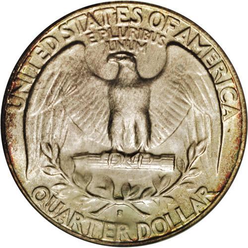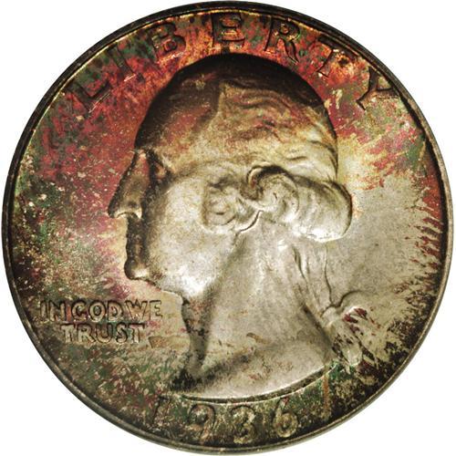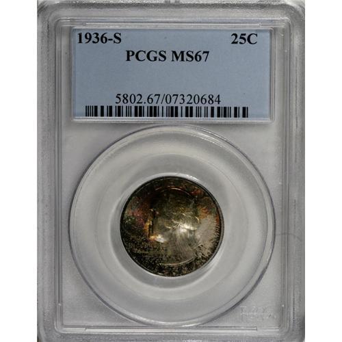 <B>1936-S 25C MS67 PCGS.</B></I> Splendid sea-green, ruby-red, and gold toning endow this lustrous and well struck low mintage quarter. The reverse is well preserved, while the obverse shows only thin marks at 3 o'clock and minor contact on the jaw. Population: 20 in 67, 0 finer (11/06).<BR><BR><b>Shipping:</b> Coin/Currency (<a target="_blank" href="http://www.heritageauctions.com/common/shipping.php">view shipping information</a>)